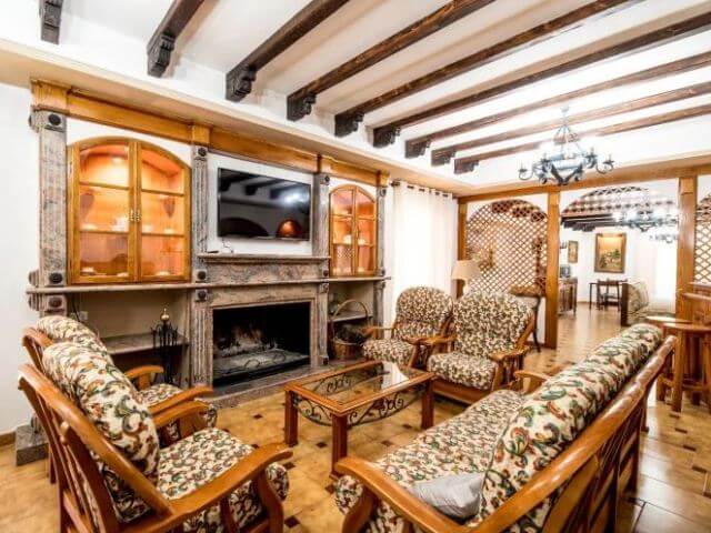 La casa dispone de siete habitaciones, todas con baño privado, y algunas con bañera de hidromasaje o terraza. En el interior, destaca un comedor amplio y acogedores salones con chimenea. En el exterior, una piscina con cromoterapia y zona de barbacoa completan una estancia pensada para compartir sin renunciar al descanso personal.