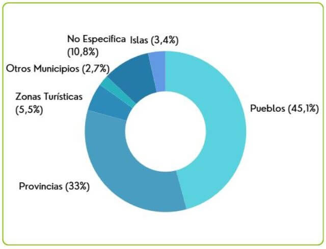 En 2025, la mayor parte de las consultas hacen referencia a pueblos concretos, que concentran el 45,1% del total. En segundo lugar se sitúan las búsquedas que mencionan una provincia, con un 33%. Por otro lado, un 10,8% de las consultas no especifican un destino concreto, limitándose a términos más generales relacionados con el turismo rural.