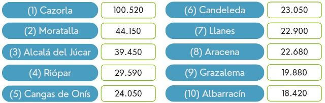 | 4 | Riópar | Albacete | 29.590 | 29 | Navacerrada | Madrid | 9.330 |