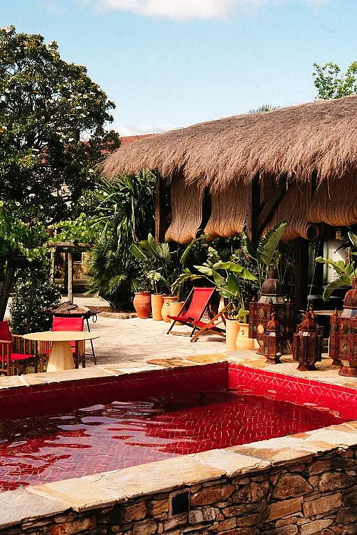 La villa, de fachada rosa intenso, sorprende por unos interiores que evocan la obra de Yves Saint Laurent y una mezcla de estilos que otorgan una identidad muy marcada. Las 13 suites se complementan con 6 yurts de lujo distribuidas por el jardín.