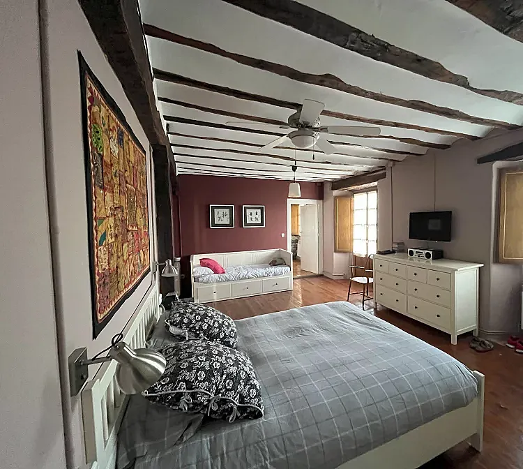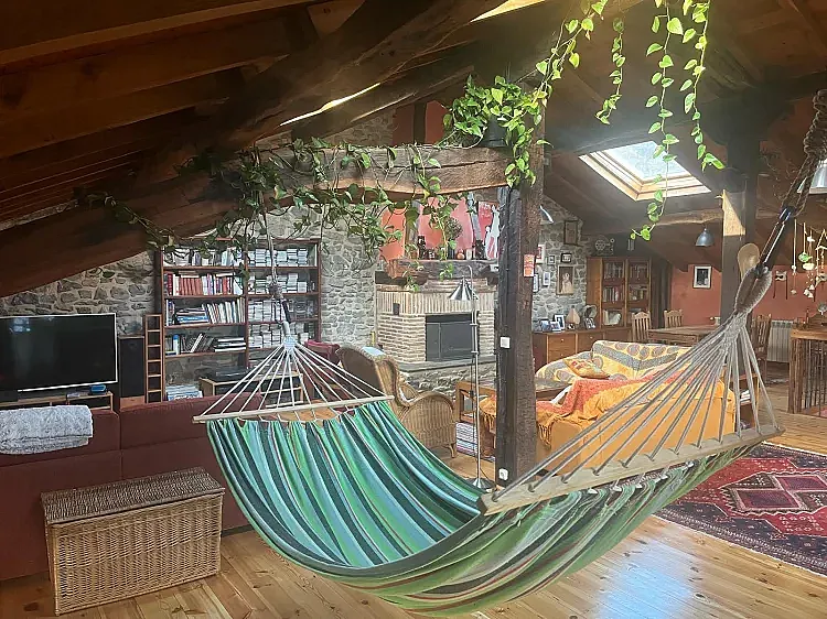 Uno de los espacios más llamativos de la casa es el salón abuhardillado de más de 130 m², muy luminoso y organizado en distintos ambientes para juegos, lectura, música o descanso, con una gran chimenea como punto central.
