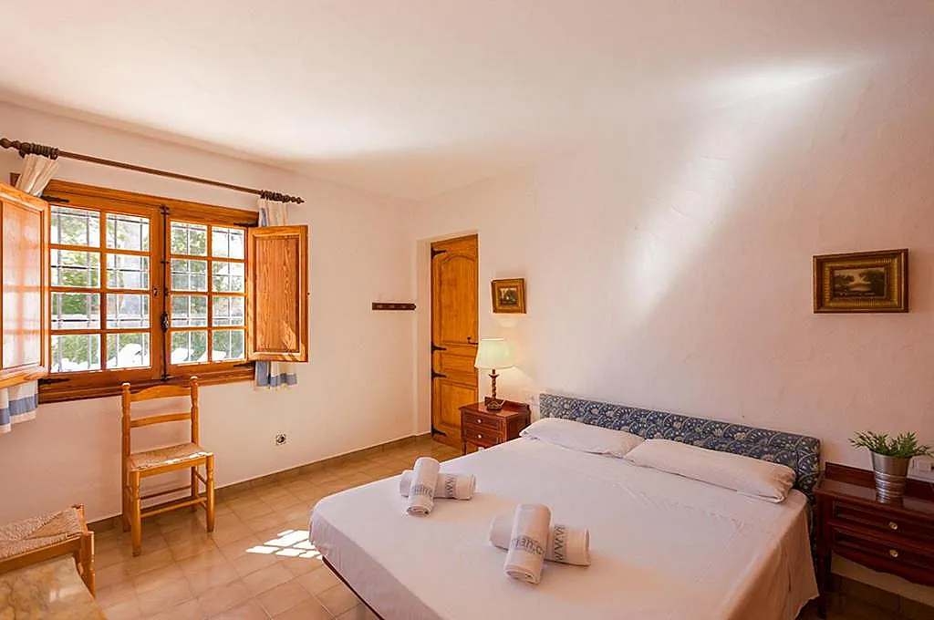 La planta superior alberga tres dormitorios más, dos de ellos con camas individuales y aire acondicionado, y un baño adicional. La villa también ofrece una terraza, jardín, piscina privada y barbacoa de obra, lo que la convierte en el lugar perfecto para disfrutar del buen clima mediterráneo.