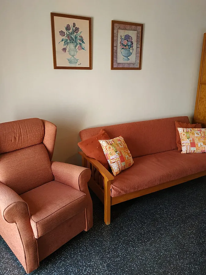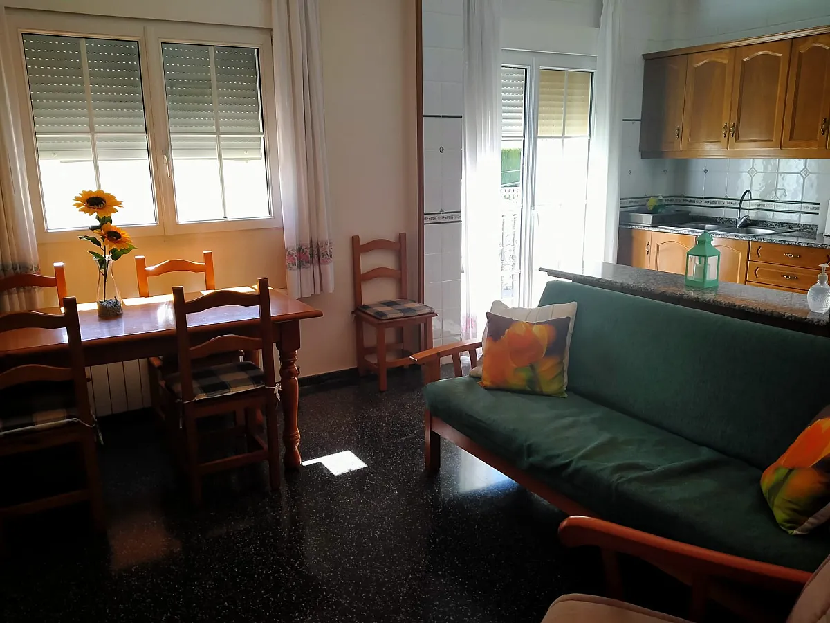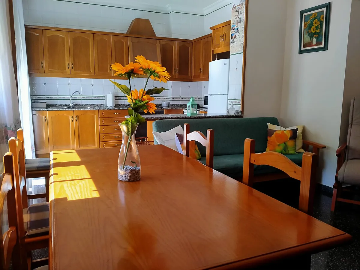 La casa cuenta con un salón comedor con cocina americana, creando un espacio abierto y luminoso. El salón está amueblado con un conjunto de sillones y una butaca, frente a un mueble de madera con televisión de plasma. La cocina, equipada con todos los electrodomésticos y menaje necesarios, tiene acceso a un balcón, proporcionando un espacio adicional para disfrutar del aire libre.