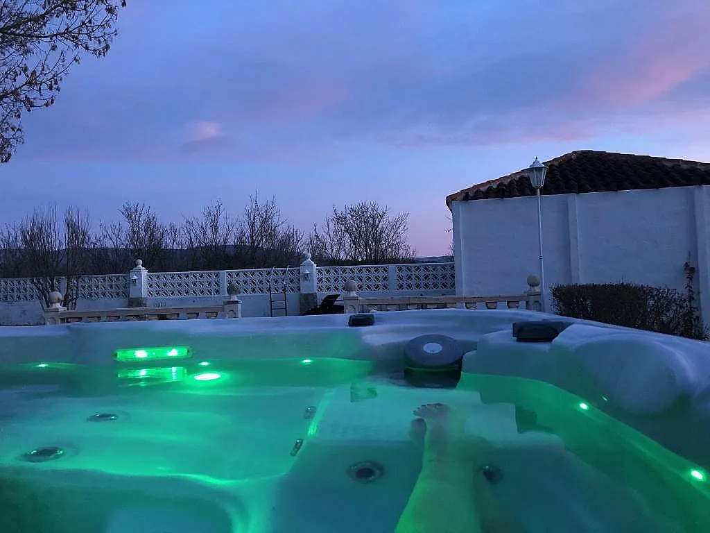 La piscina de magnesio favorece la relajación muscular, mientras que las zonas comunes, como el bar-salón cubierto, permiten disfrutar del entorno en cualquier momento del día.