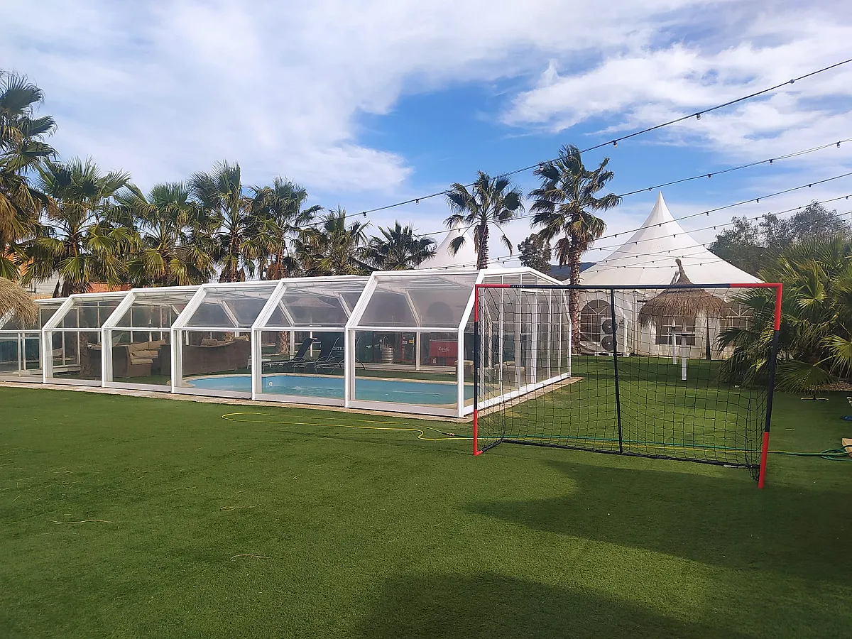 En el exterior se encuentra la piscina climatizada, que puede cubrirse si es necesario. Está rodeada de hamacas, sombrillas y una terraza ideal para aprovechar el sol andaluz o disfrutar del fresco al caer la tarde.