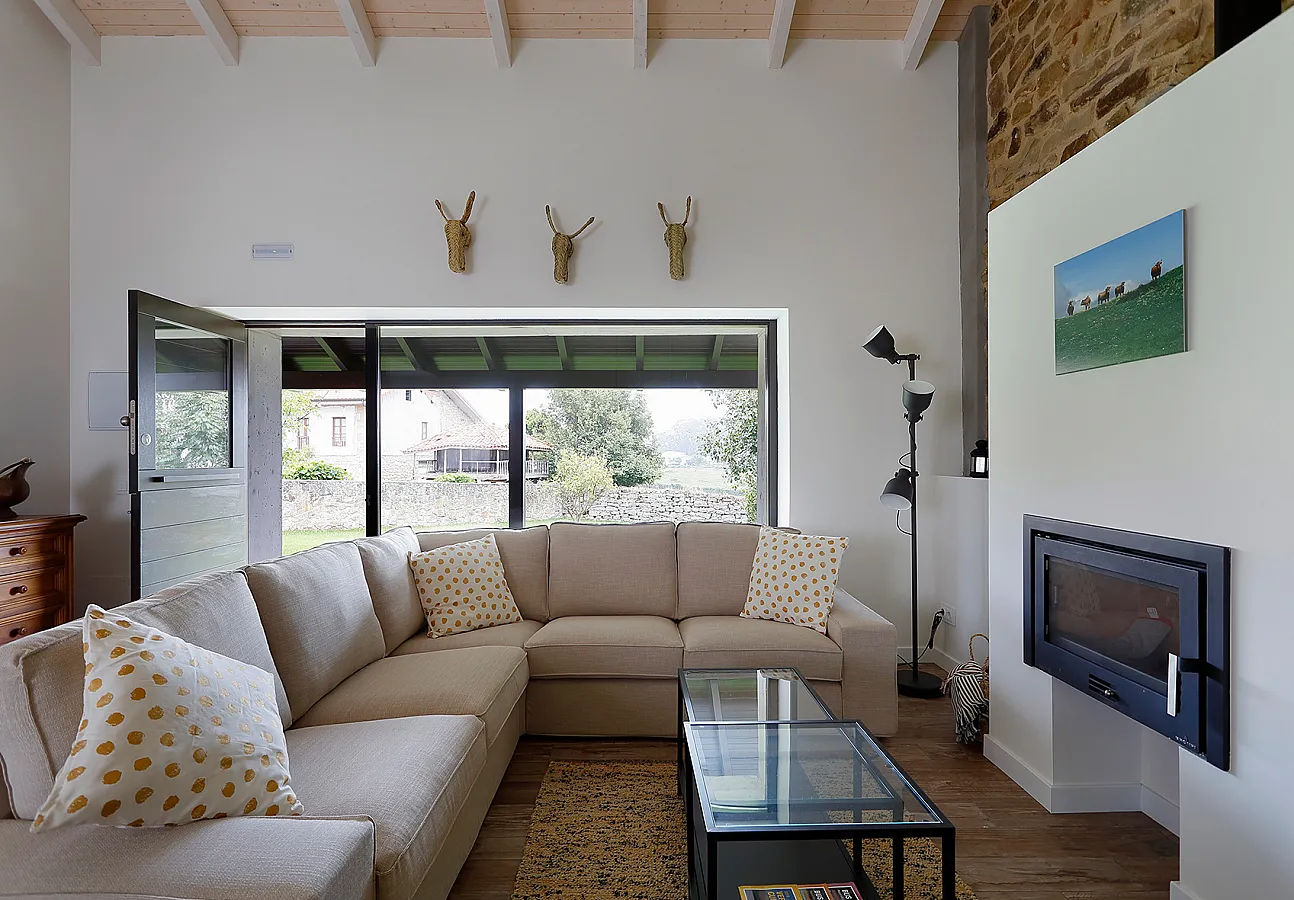 El espacio común reúne salón amplio con chimenea, televisión de pantalla plana, comedor y cocina totalmente equipada con vitrocerámica, nevera, microondas, lavavajillas, cafetera Nespresso e italiana, tostadora y el menaje necesario para su capacidad.