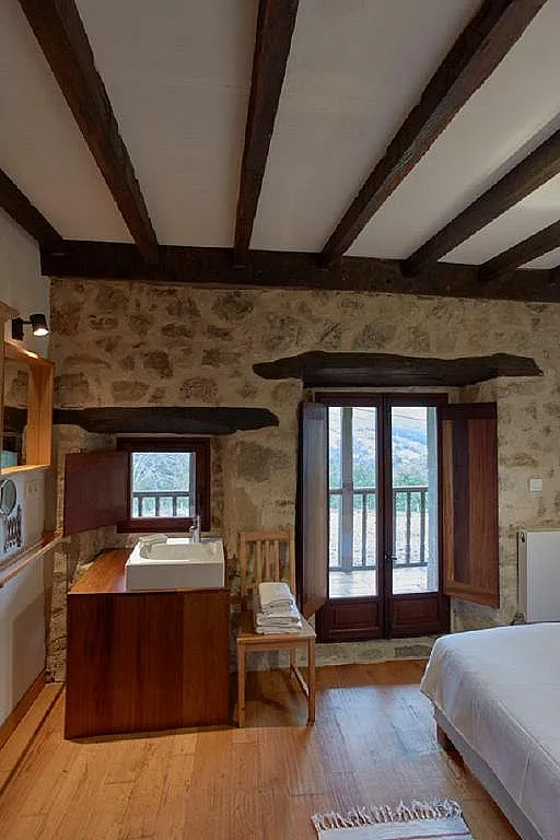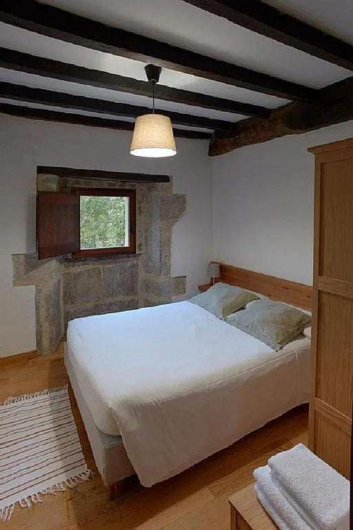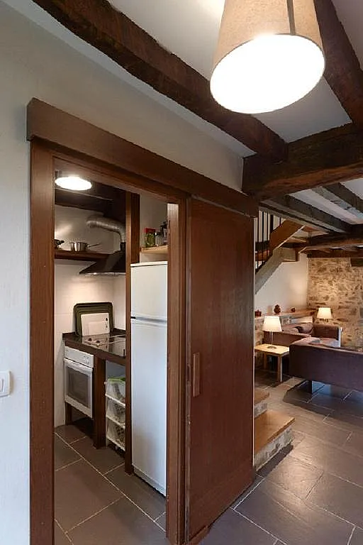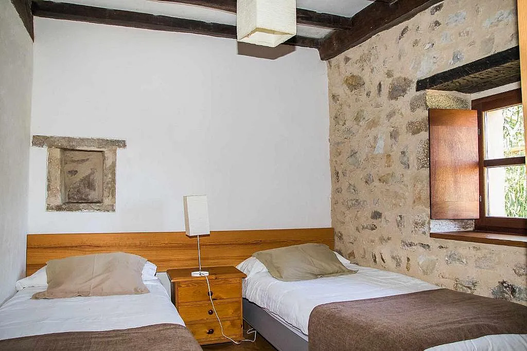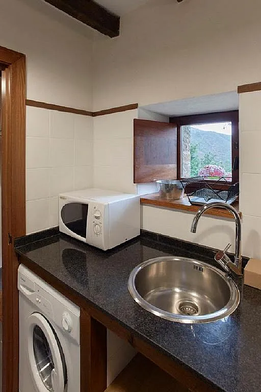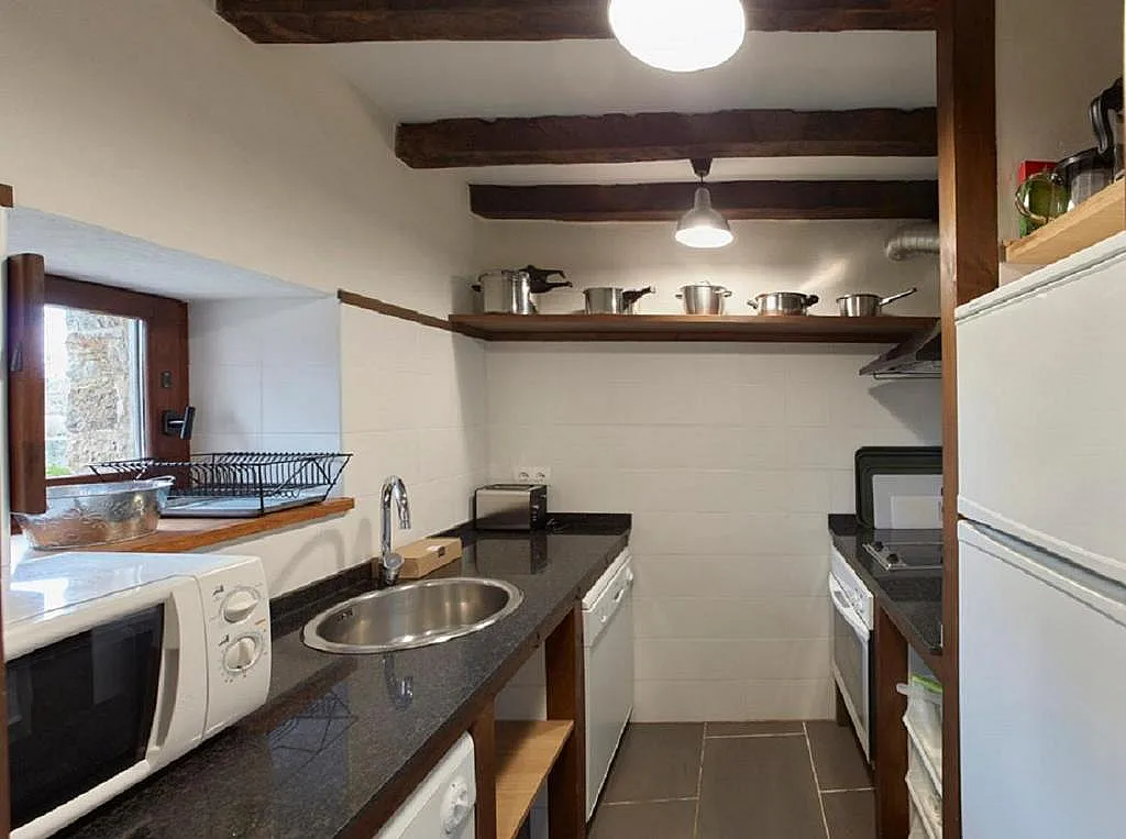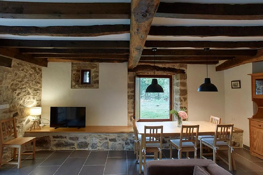 La cocina, independiente, dispone de todos los electrodomésticos y menaje necesarios. El salón, amplio y decorado en tonos cálidos, mantiene el estilo rural con muros de piedra y techos de madera, y conecta con una zona de comedor que mira hacia el entorno exterior.