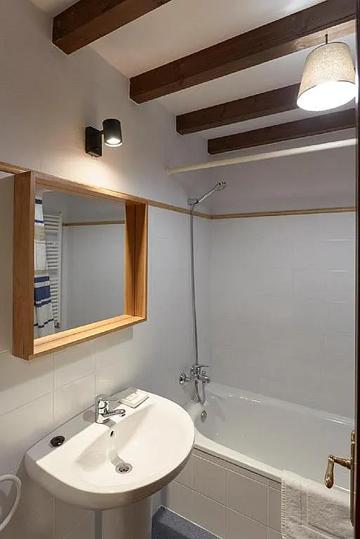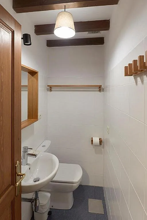 En la planta superior se encuentran 2 habitaciones dobles: una con cama de matrimonio y otra con dos camas individuales. Además, la casa cuenta con un baño completo con bañera y un aseo adicional en la planta baja. Ambas habitaciones mantienen una estética acogedora.