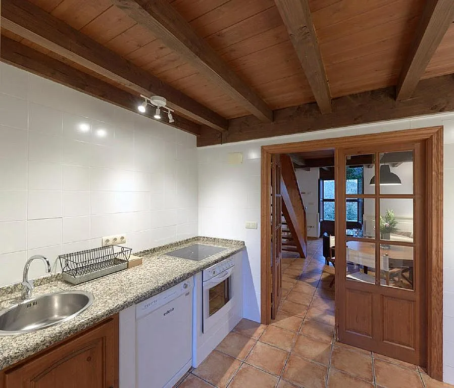 Desde allí, la luz entra a través de un amplio ventanal que da al jardín, iluminando tanto la mesa de comedor como la zona de sofás orientada a la televisión. La cocina, independiente y totalmente equipada, está pensada para un uso cómodo durante toda la estancia.