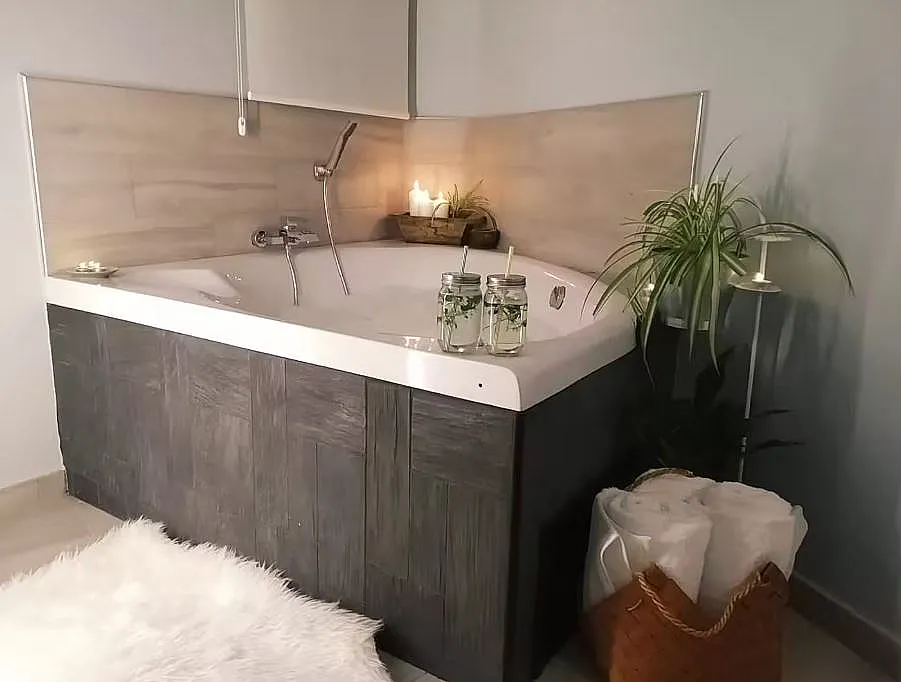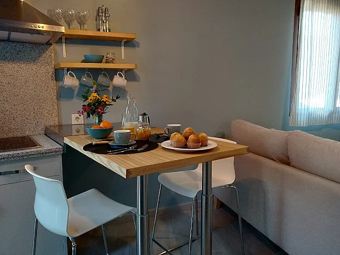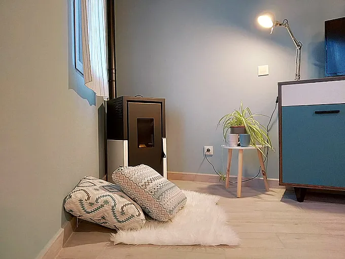 El apartamento cuenta con una habitación principal que incluye un jacuzzi, ideal para relajarse después de un día explorando la naturaleza. El salón, equipado con una chimenea de pellets, proporciona un ambiente cálido y acogedor.