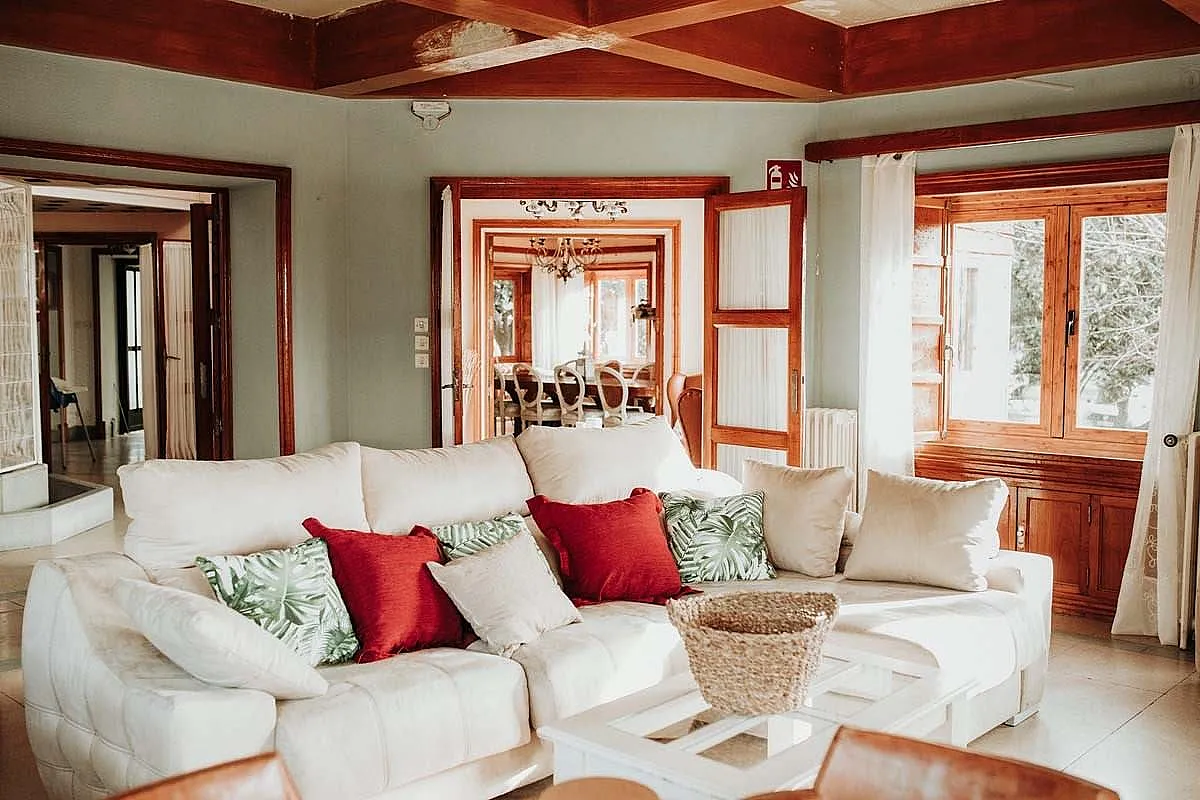 Los dos grandes salones con chimenea y la entrañable cocina hacen de esta casa un lugar acogedor y cómodo para disfrutar en familia o con amigos. La casa está rodeada de amplias terrazas de piedra, perfectamente amuebladas, que permiten disfrutar de los inmensos jardines que la rodean.