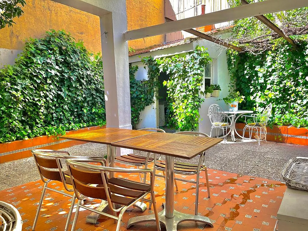 Además, cuenta con una amplia terraza techada junto al parral y dos plazas de garaje cubiertas, así como una zona de barbacoa. Desde Casa Gredos se pueden disfrutar de vistas extraordinarias al gran patio central de las Escuelas de Candeleda, rodeado de palmeras y con vistas a la imponente Sierra de Gredos.
