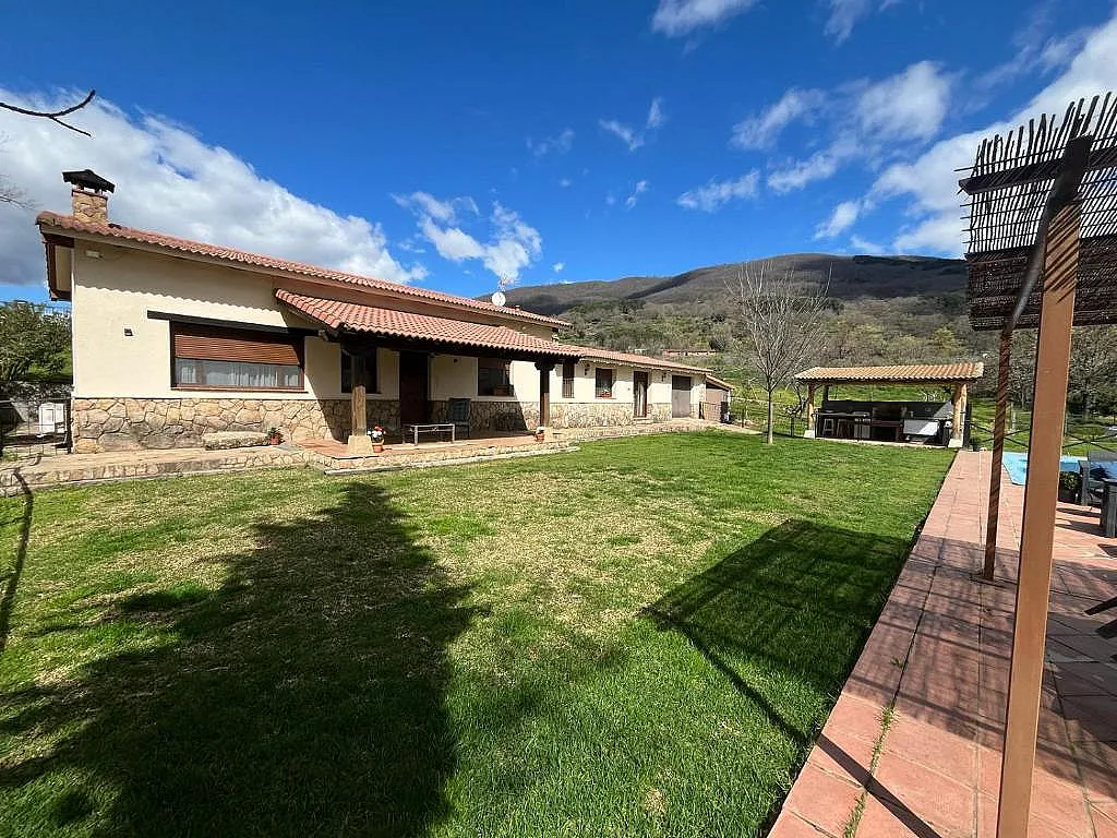 Casa La Senda de Gredos es una espectacular casa rural ubicada en una zona residencial de Candeleda, rodeada de árboles y plantas que invitan al relax y al confort. Con 330 m² construidos, esta casa ofrece un amplio jardín, una gran piscina y un hermoso salón de 50 m² con chimenea, ideal para disfrutar de momentos inolvidables en compañía de amigos y familiares.
