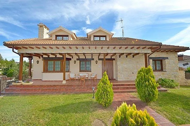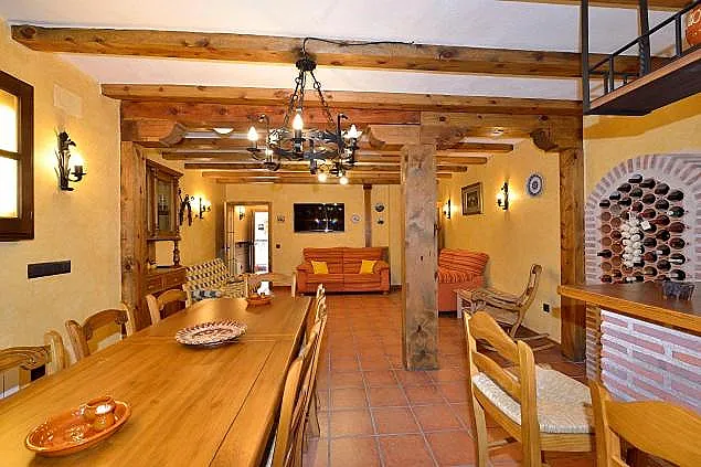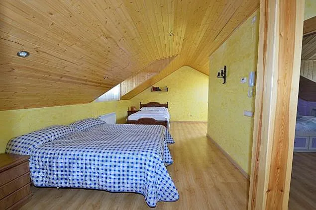 La planta baja alberga un salón con dos sofás cama, una cocina independiente completamente equipada y un dormitorio principal con baño en suite. En la planta superior, hay un dormitorio principal, un dormitorio doble, un dormitorio individual y un dormitorio cuádruple, además de un baño compartido. La bodega y el aseo en la planta inferior completan las comodidades de esta vivienda. Todas las habitaciones están equipadas con televisión, y la casa cuenta con un garaje para dos coches.