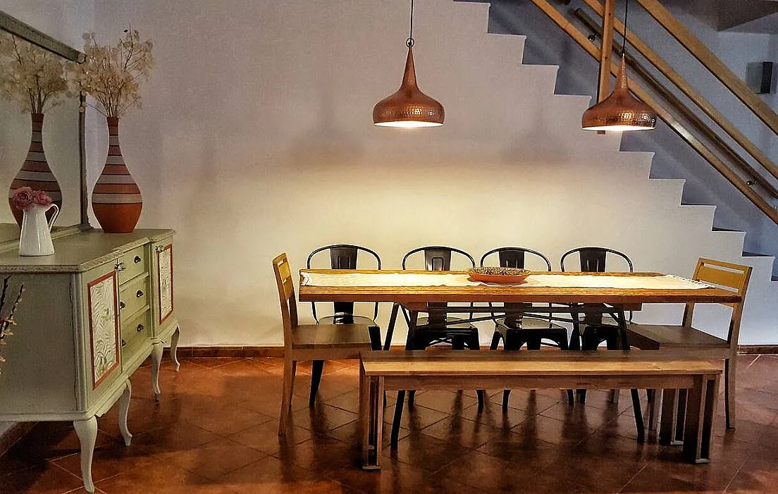 El interior de la casa está decorado con un estilo rústico vintage y materiales libres de tóxicos. La casa dispone de una gran cocina totalmente equipada, una zona de relax con TV plana y una salita-biblioteca con zona de juegos. Además, ofrece amenities, servicio de toallas de piscina, wifi y colchones antialérgicos, asegurando una estancia confortable para todos los huéspedes.