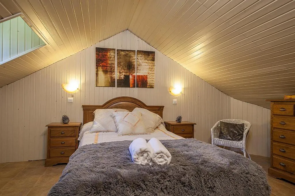 La casa, con una superficie de 150 m² en el interior y un porche de 50 m², tiene capacidad para 12 personas en 5 habitaciones. Dispone de 3 baños y un amplio salón luminoso con chimenea. El acceso a la casa incluye un kilómetro de camino rural, ofreciendo una experiencia inmersiva en la naturaleza desde el momento de la llegada.