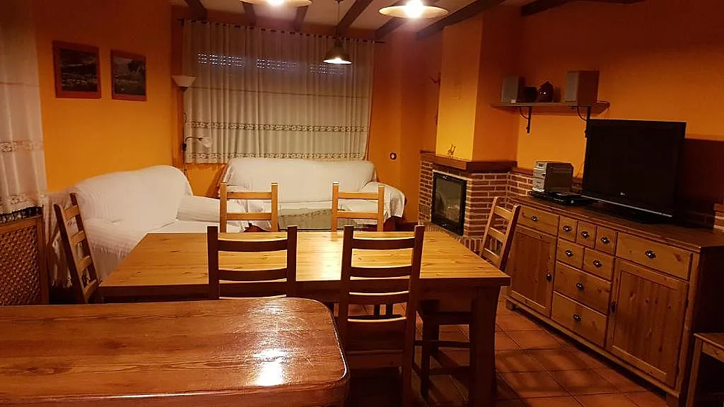 La planta baja dispone de una cocina americana moderna equipada con vitrocerámica, microondas, lavadora, frigorífico y campana de acero, además de utensilios suficientes para 10 personas. El salón cuenta con una pared decorada con piedra, un sofá, un sofá cama, un butacón, una mesa baja, una mesa extensible de comedor con 8 sillas, televisión y chimenea con cassette de leña.