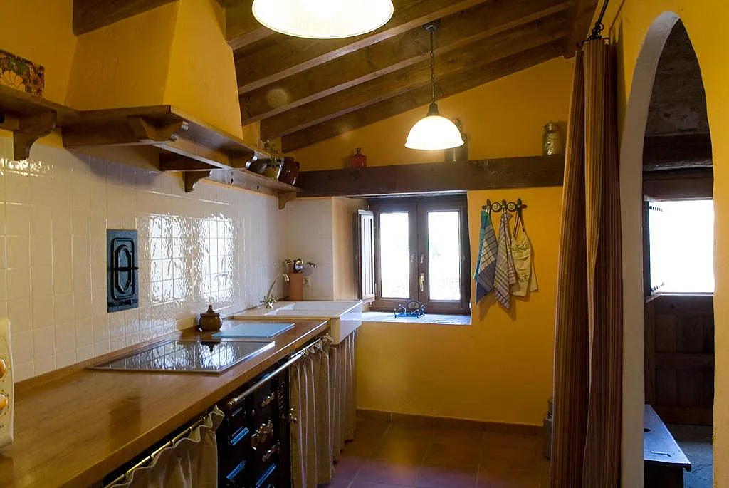 La cocina está completamente equipada con frigorífico, lavadora, microondas y vitrocerámica de 4 fuegos, ofreciendo todas las facilidades necesarias para una estancia cómoda. Además, la casa dispone de calefacción eléctrica de acumuladores nocturnos y un patio con barbacoa, ideal para disfrutar de comidas al aire libre.