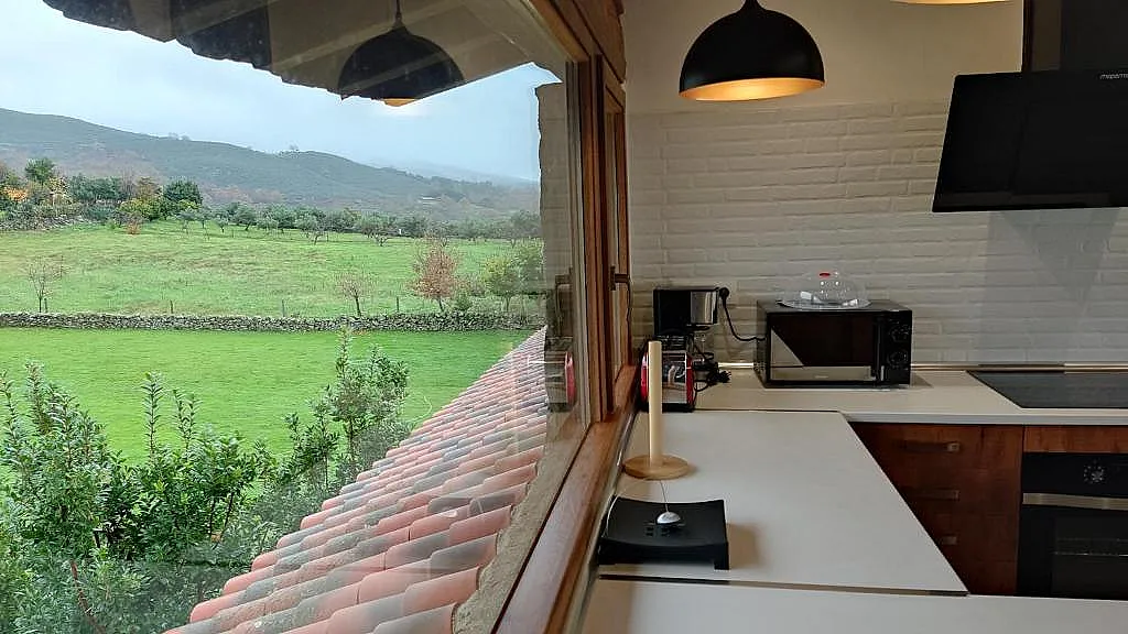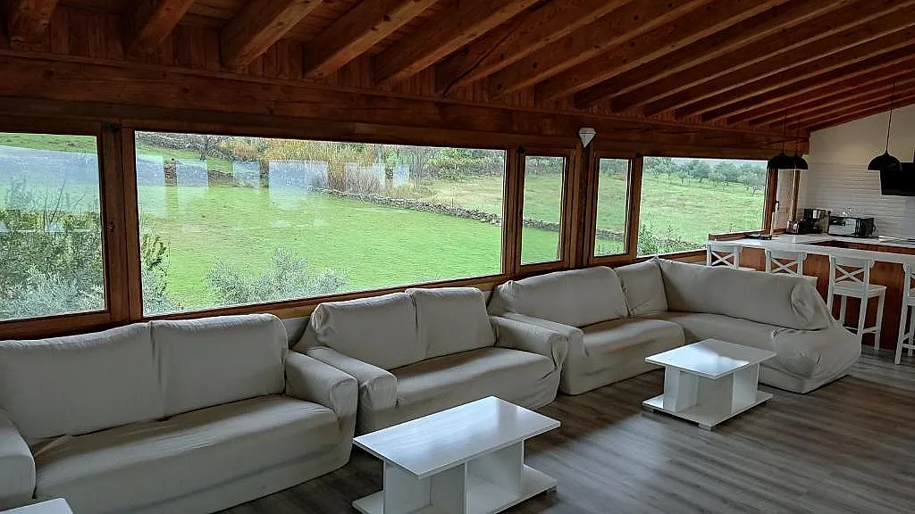 Cada habitación cuenta con su propio aseo con ducha, TV plana de 32", calefacción y aire acondicionado, además de conexión Wi-Fi gratuita. La casa rural también ofrece un amplio salón mirador de 100 m², climatizado y equipado con dos barras americanas, dos cocinas completas, una zona de estar con sofás y una zona de comedor, ideal para grupos grandes.