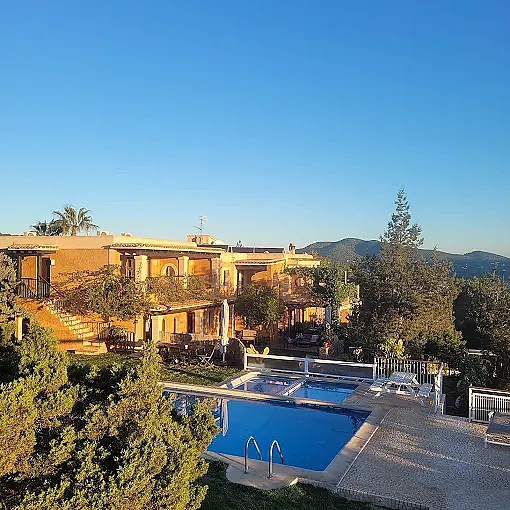En el exterior, los huéspedes pueden disfrutar de una piscina, una piscina infantil, amplias terrazas y jardines. También cuenta con un gimnasio al aire libre con vistas al valle, dos jacuzzis (interior y exterior) y una sauna, ideales para quienes buscan relajarse. Además, dispone de una pista de tenis gratuita y un parque infantil para los más pequeños.