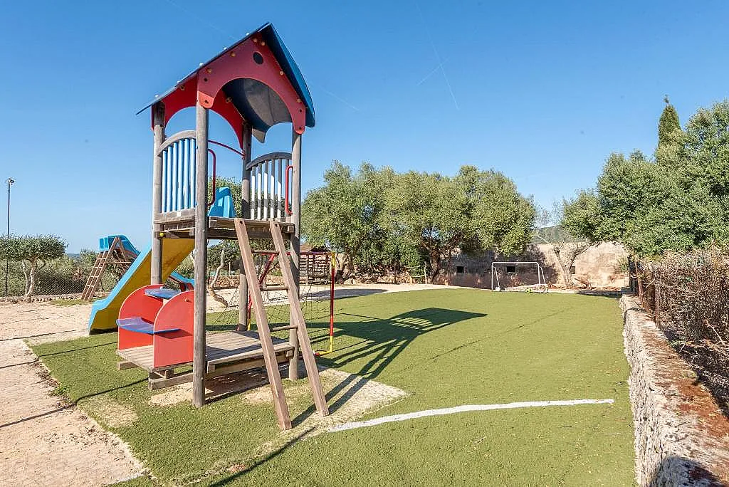 La finca cuenta con dos piscinas, una para adultos y otra para niños, rodeadas de jardines llenos de vegetación mediterránea. Los huéspedes pueden disfrutar de zonas de juegos, un pequeño campo de fútbol y rincones tranquilos para picnics o barbacoas.