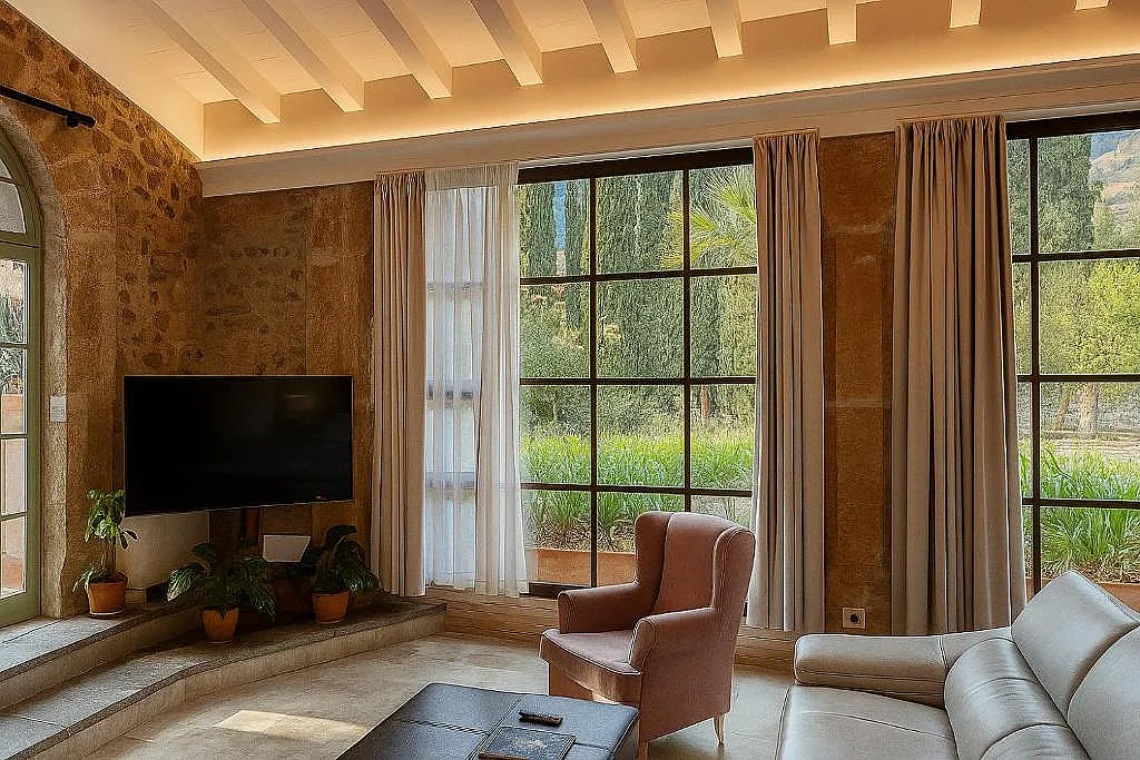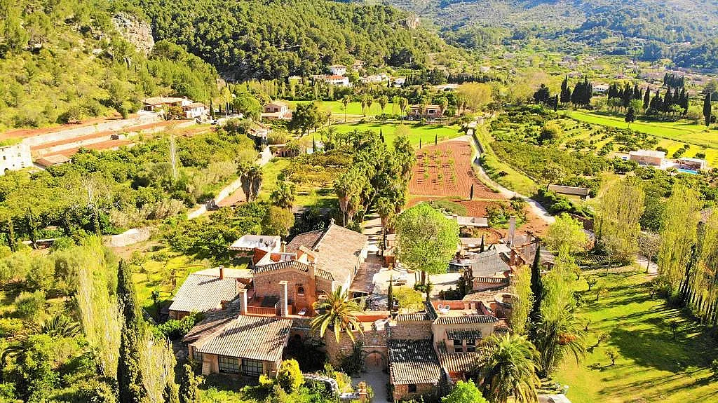 Con una extensión de 120.000 m², la finca incluye 4 casas mallorquinas convertidas en 29 habitaciones, cada una con terraza y vistas excepcionales al valle y a los huertos de naranjos.