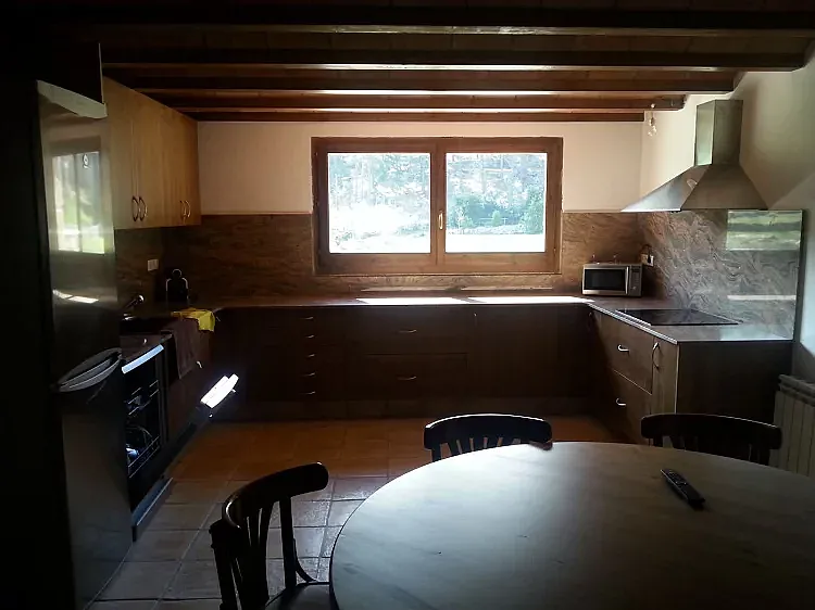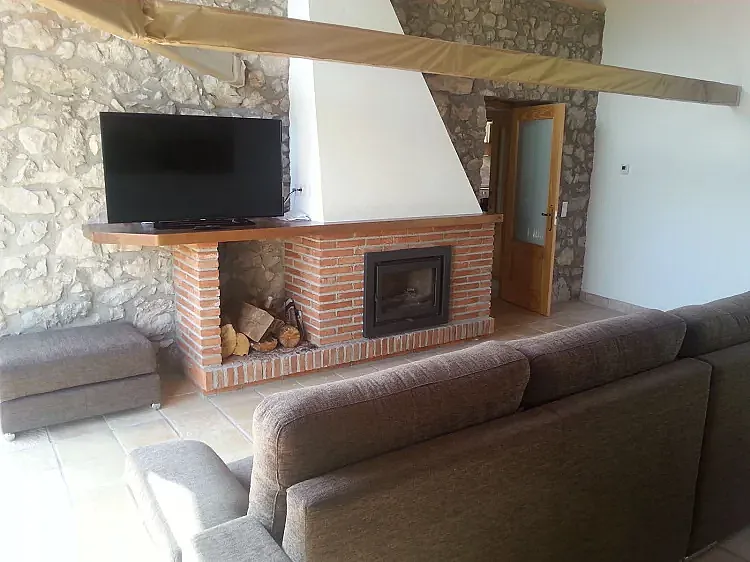El corazón de la vivienda es un amplio salón de estilo moderno con muros de piedra vista, mobiliario en tonos sobrios y TV de pantalla plana. La chimenea aporta un punto cálido cuando refresca, y las grandes ventanas enmarcan panorámicas espectaculares. La cocina es independiente y está equipada con microondas, lavavajillas, nevera y menaje completo, pensada para cocinar con comodidad.