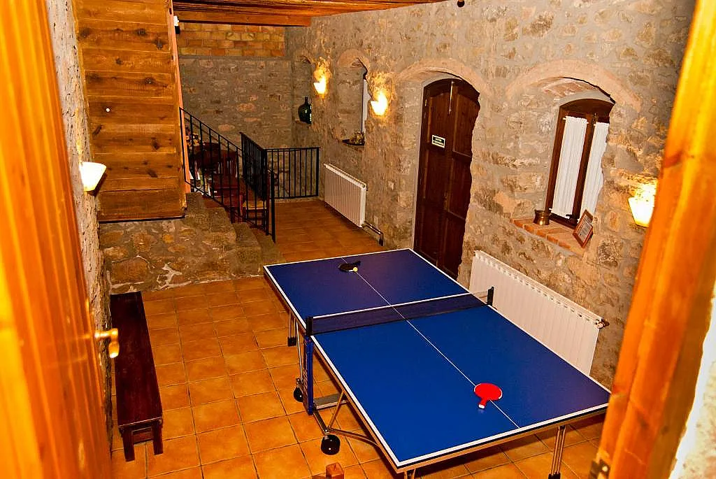 La casa tiene capacidad para 6 personas y dispone de 4 habitaciones (2 dobles y 2 individuales), 2 baños completos, una cocina totalmente equipada y una sala de televisión con sofás. También cuenta con una sala con mesa de ping-pong, garaje privado y barbacoa.