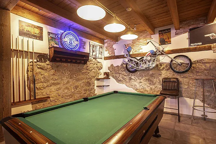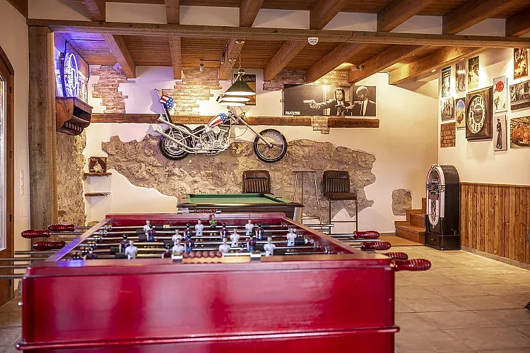 En la planta baja, destaca una sala de juegos con jukebox, futbolín, billar, air hockey y más. Desde aquí, se accede al patio exterior con barbacoa cubierta y zona de relax.