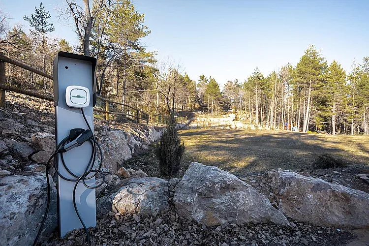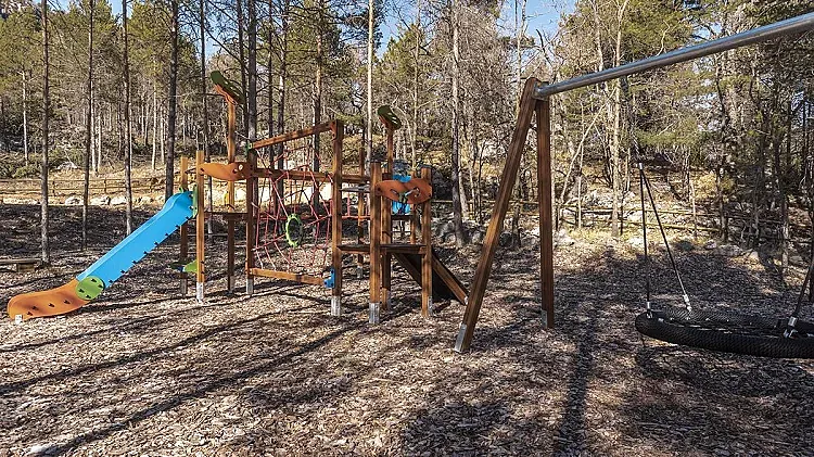 El exterior incluye una piscina climatizada con cúpula, operativa de mayo a noviembre, y una zona infantil con parque, cama elástica y césped para jugar. También hay espacio para hacer fuego de campo y disfrutar de las estrellas.