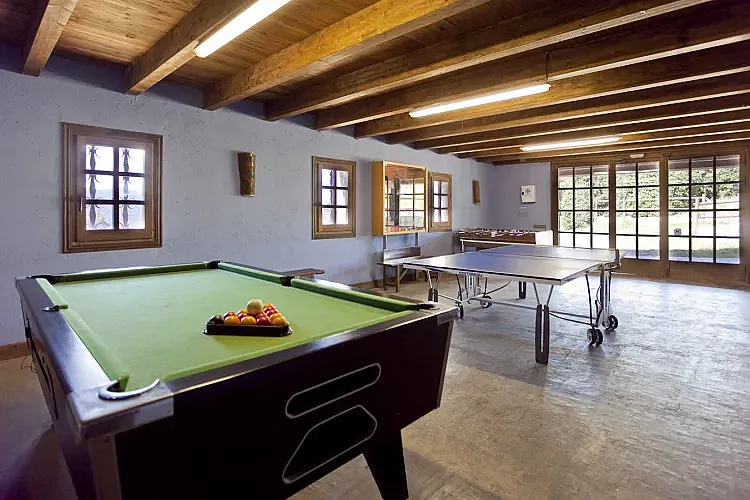 La casa está distribuida en cuatro habitaciones dobles y una habitación cuádruple, además de 5 baños completos. La cocina está completamente equipada y hay un amplio comedor, así como una sala de estar con chimenea y televisión. En el exterior, los huéspedes pueden disfrutar de una barbacoa y de una piscina de 9x4 metros, rodeada de césped y zonas de descanso.
