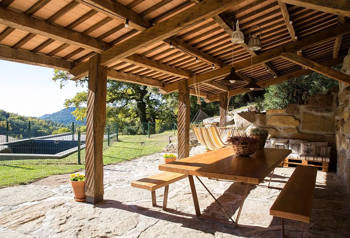 El exterior cuenta con una piscina y un magnífico porche integrado con barbacoa y una zona de chill out, ideal para relajarse y disfrutar del paisaje. Además, la casa está equipada con estufa de biomasa, Wi-Fi, TV, lavavajillas, lavadora y colchones, ropa de cama y toallas de alta calidad.