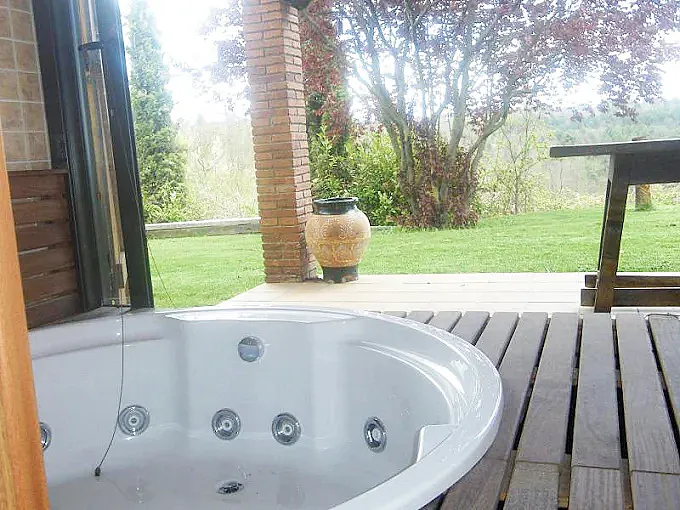 La cocina está completamente equipada con todo lo necesario para cocinar para un grupo, y también hay una habitación doble con baño privado que incluye un jacuzzi. En la planta superior, se encuentran las otras tres habitaciones, dos de ellas triples y una doble con literas, además de un baño adicional.