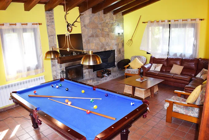 La planta baja de Les Prunes cuenta con un amplio salón-comedor equipado con un cómodo sofá, televisión de 59”, equipo de música, chimenea y una mesa de billar americano convertible en mesa de comedor.