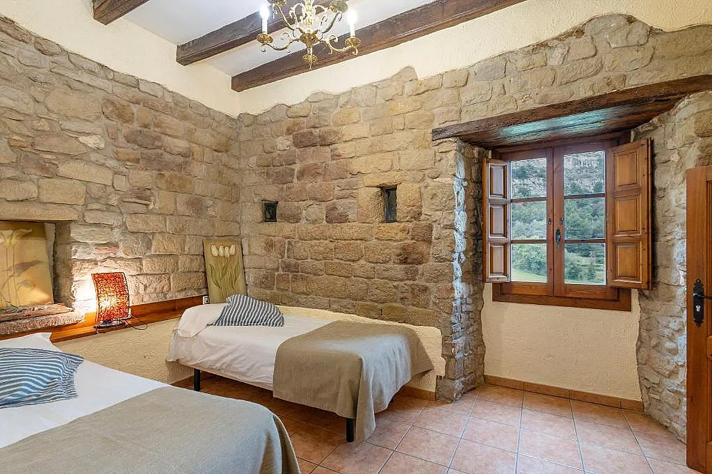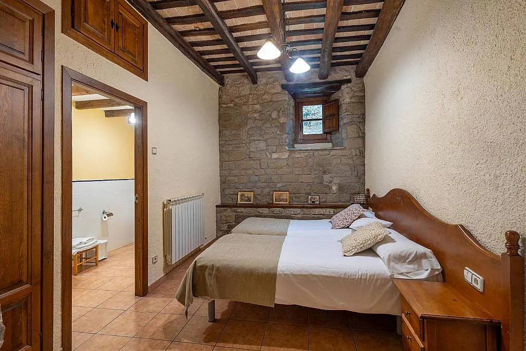 La masía cuenta con 5 habitaciones dobles, todas ellas equipadas con baño privado, ropa de cama y toallas. Su ambiente rústico, con paredes de piedra y vigas de roble, crea una atmósfera acogedora y confortable.