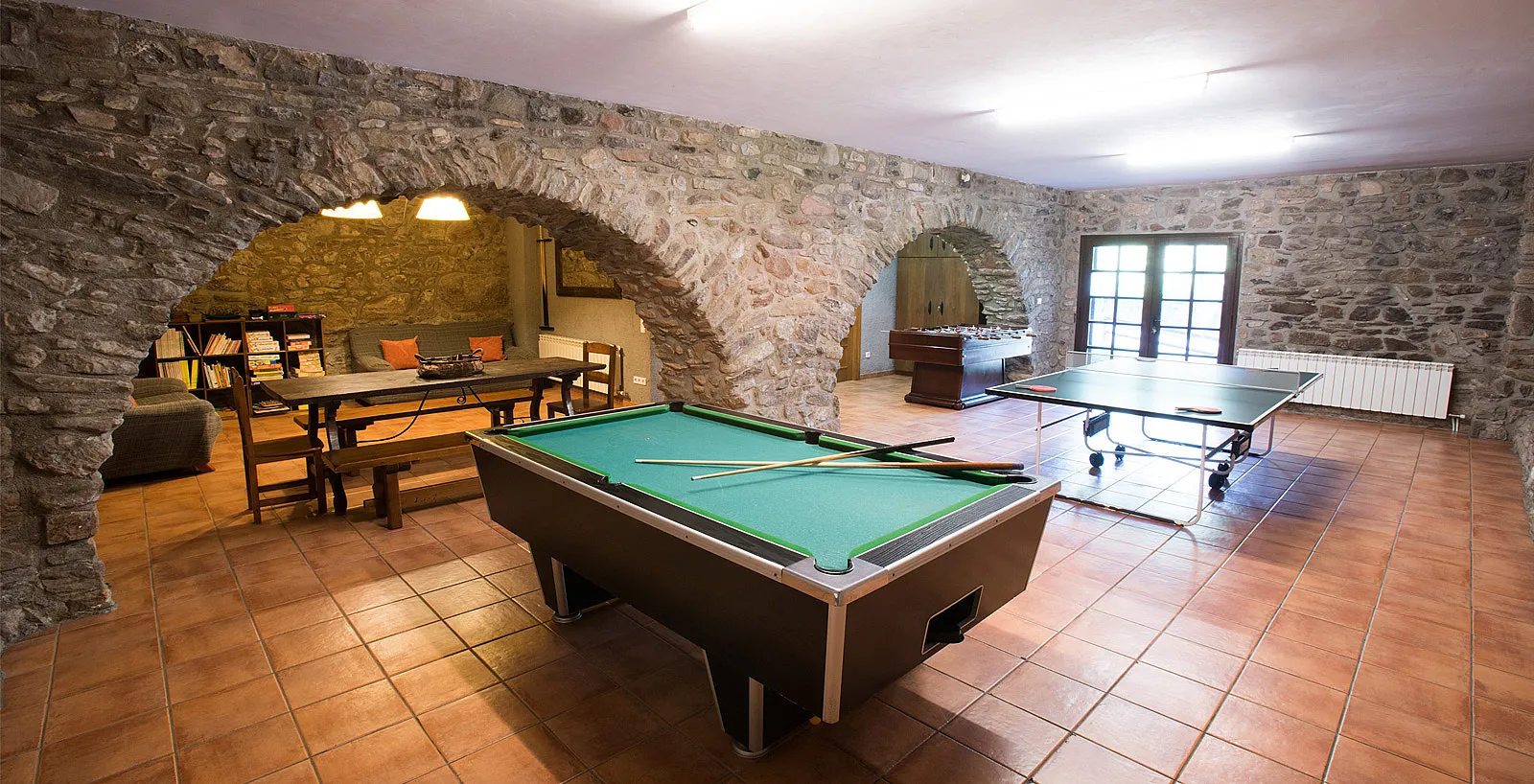 En la planta inferior se encuentra la sala de juegos con billar, futbolín, tenis de mesa, dardos y juegos de mesa, además de una biblioteca infantil y juegos educativos. Los exteriores de Masia Sarga incluyen una era de 300 m² rodeada por un muro de piedra, el Pajar con barbacoa y zonas para tomar el sol, una piscina con área de césped y un jardín de 500 m² con cerca de madera.