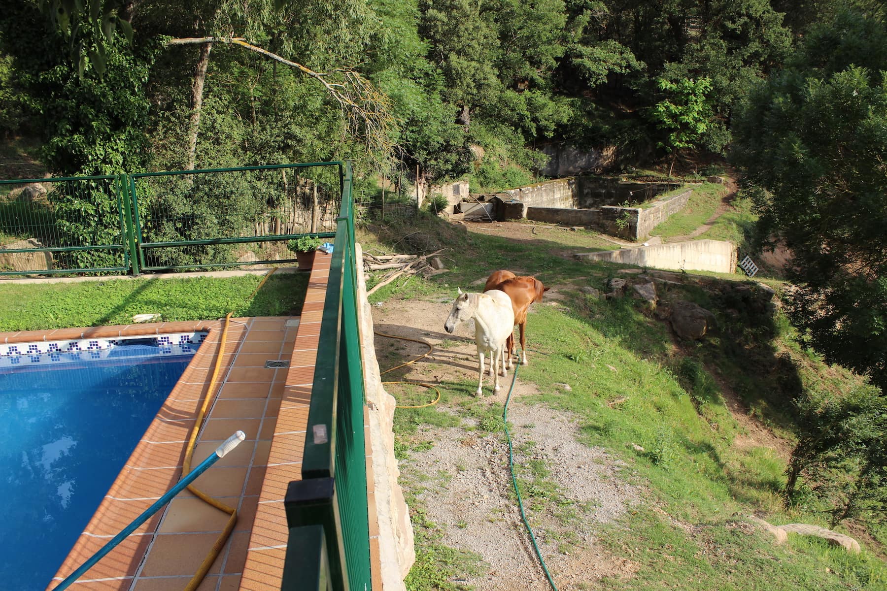 El exterior de Masoveria Riambau incluye un gran porche con barbacoa, un jardín vallado con piscina y hamacas, ofreciendo un entorno perfecto para relajarse y disfrutar de la naturaleza. El mobiliario rústico y restaurado de la casa añade un toque de autenticidad y encanto.