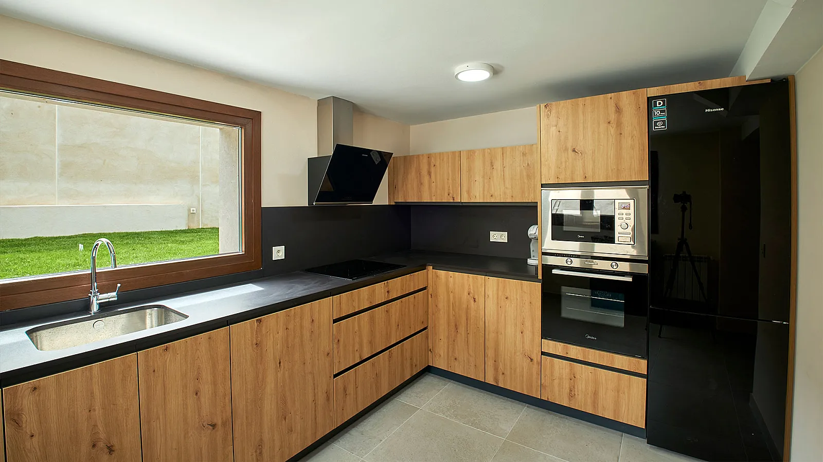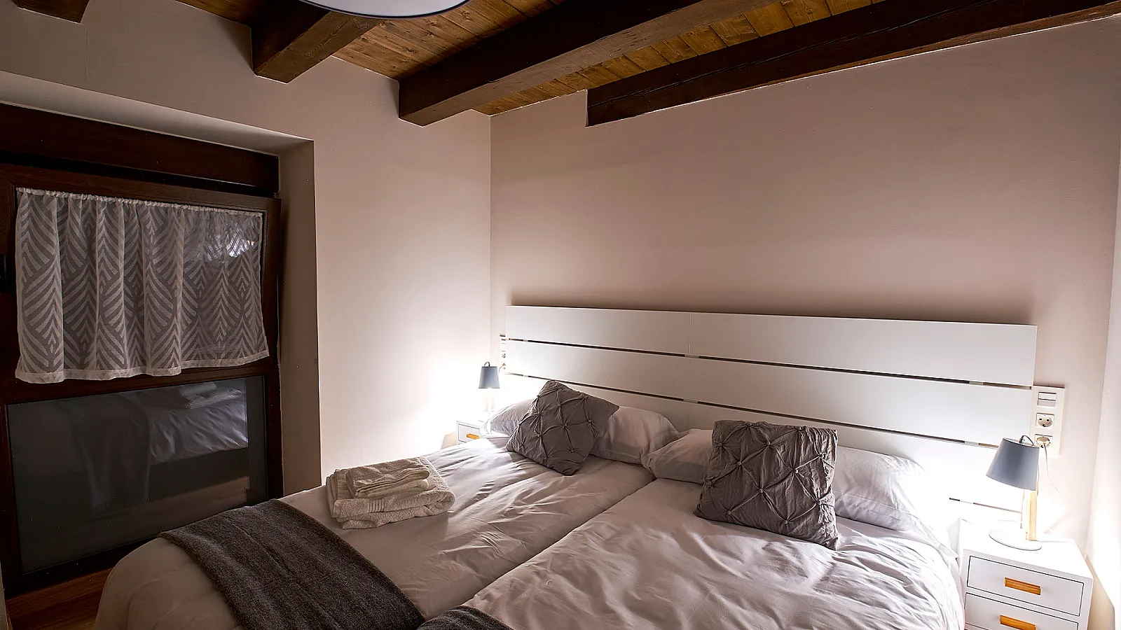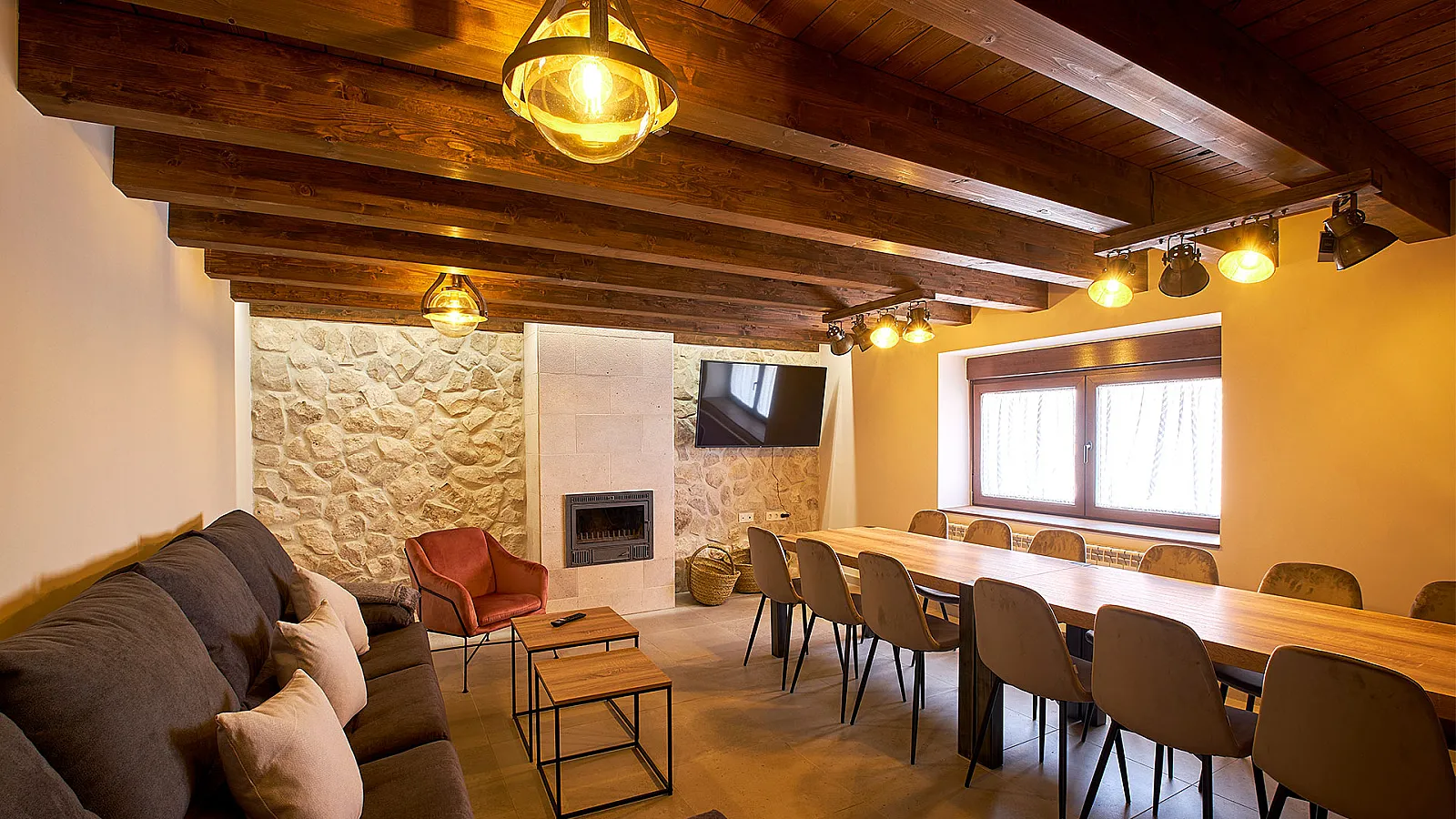 La vivienda se distribuye en dos plantas. En la planta baja se encuentra un salón amplio, un baño completo con ducha, una habitación doble y un patio con jardín. A través de una escalera de madera se accede a la primera planta, donde hay 2 habitaciones dobles (una con baño privado), 2 habitaciones triples y 2 baños adicionales, todos con ducha y luz natural.
