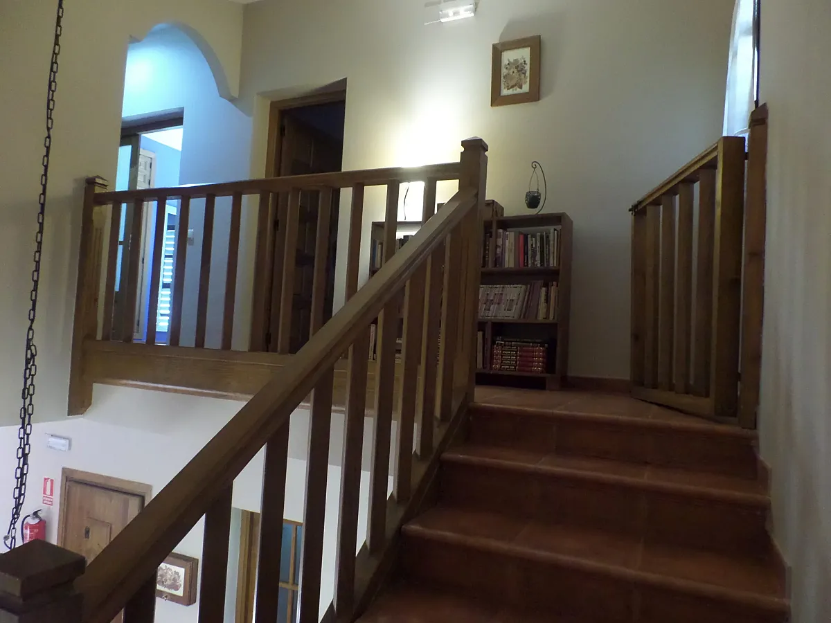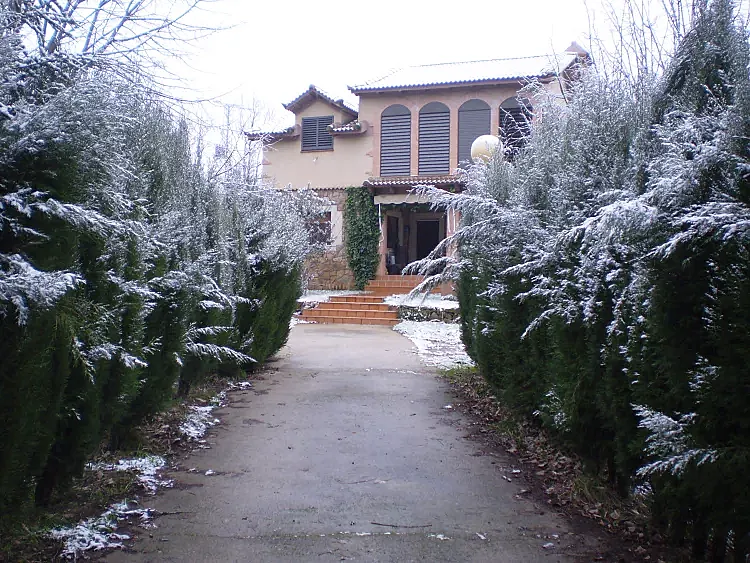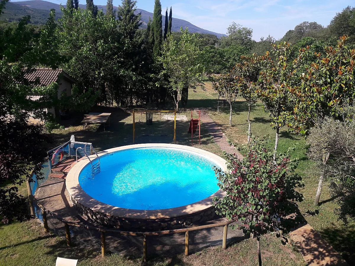 Está enclavada en una parcela de 4.000 M2. con árboles frutales y amplio jardín que dispone de zonas de césped con barbacoa, parque infantil, así como de una piscina.