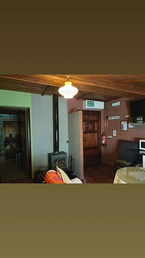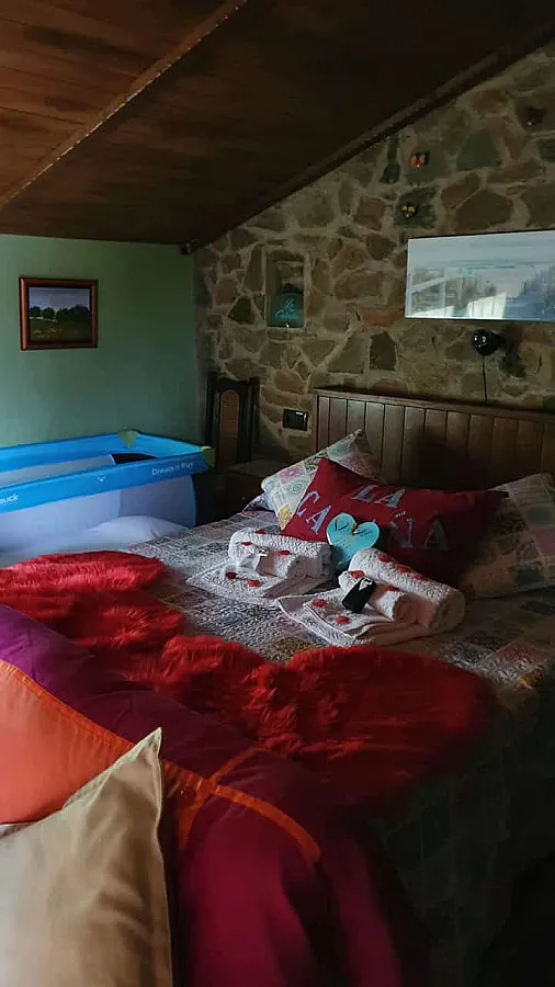 La cabaña es de lo más acogedora, compuesta por un espacio diáfano en el que se dispone el dormitorio con cama de matrimonio, dos mesitas de noche y un salón con sofá, mesa camilla y televisión LCD de 32″, equipado con chimenea de leña y aire acondicionado.