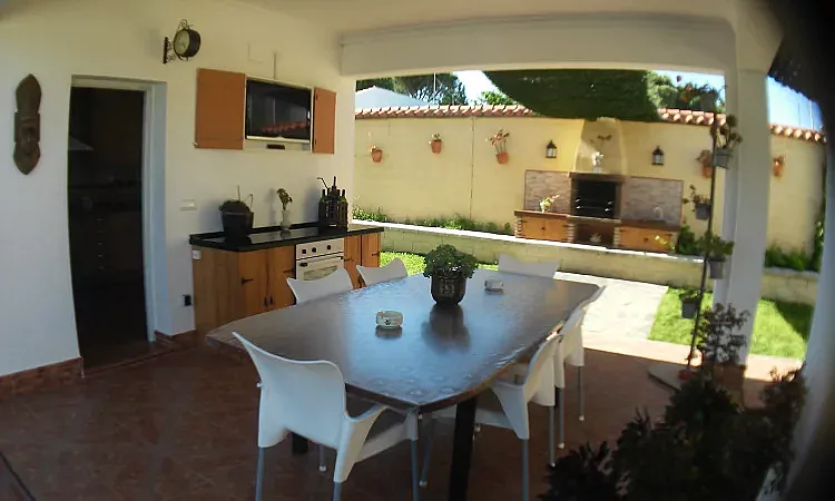 Junto a ella, un porche con mesa amplia, televisión y barbacoa. La parcela se completa con jardines independientes, zona de césped con columpios, merendero, riego automático e iluminación nocturna en todo el recinto.
