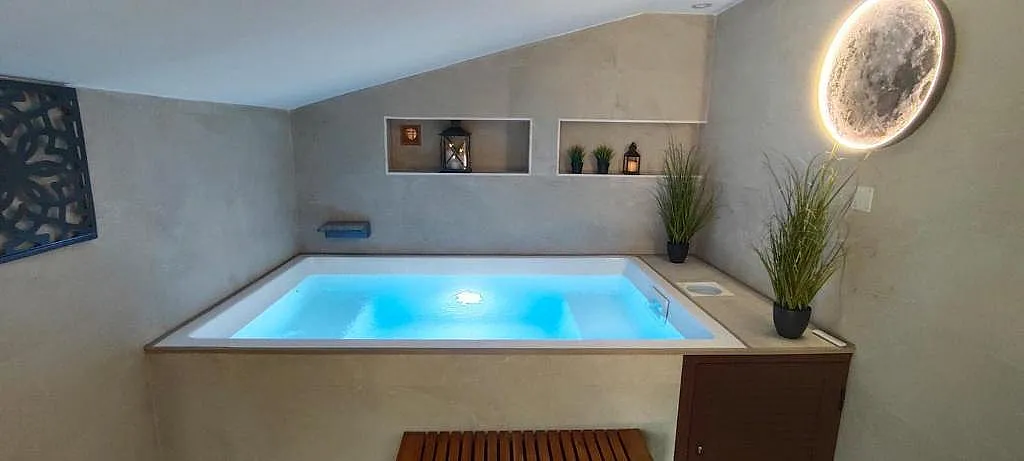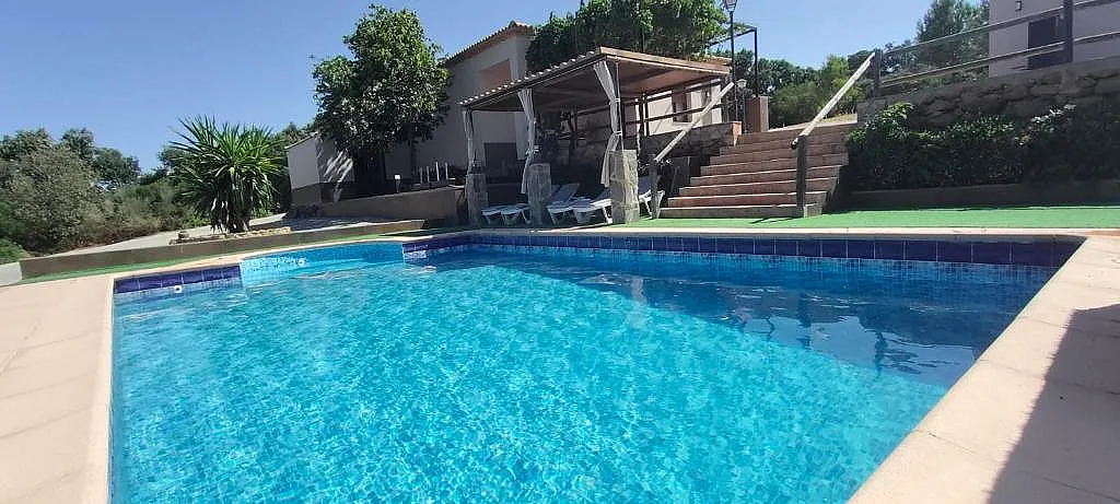 En la parcela privada, completamente vallada, se encuentra la piscina rodeada de césped, ideal para descansar o pasar un rato divertido al aire libre. Uno de los elementos más singulares del alojamiento es su hammam, una piscina de agua caliente destinada a la desconexión personal. Desde la terraza, parcialmente cubierta por una parra, pueden disfrutarse vistas a la sierra de Grazalema y atardeceres especialmente bonitos.