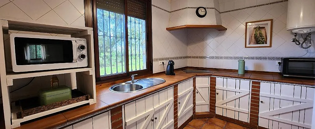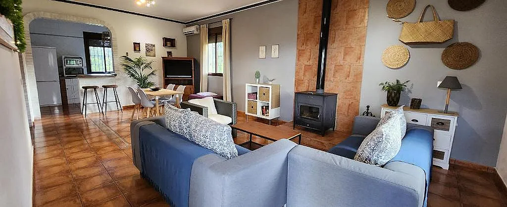 La vivienda cuenta con equipamiento completo para estancias largas o cortas: calefacción, aire acondicionado, Wi-Fi, televisión, barbacoa, aparcamiento y una cocina con todos los electrodomésticos necesarios. La decoración rústica de la cocina y la presencia de la chimenea en el salón crean un ambiente cálido durante los meses fríos.