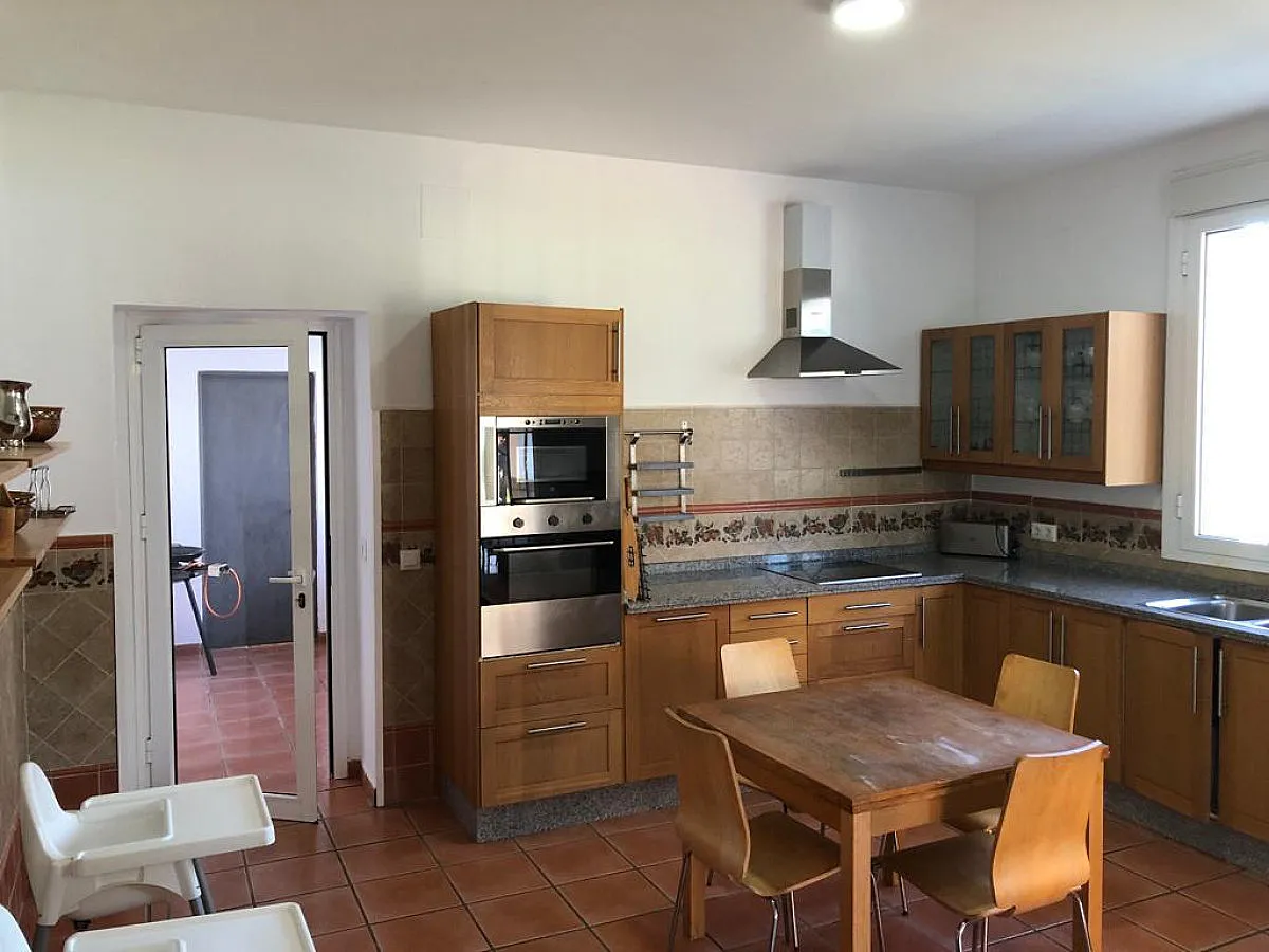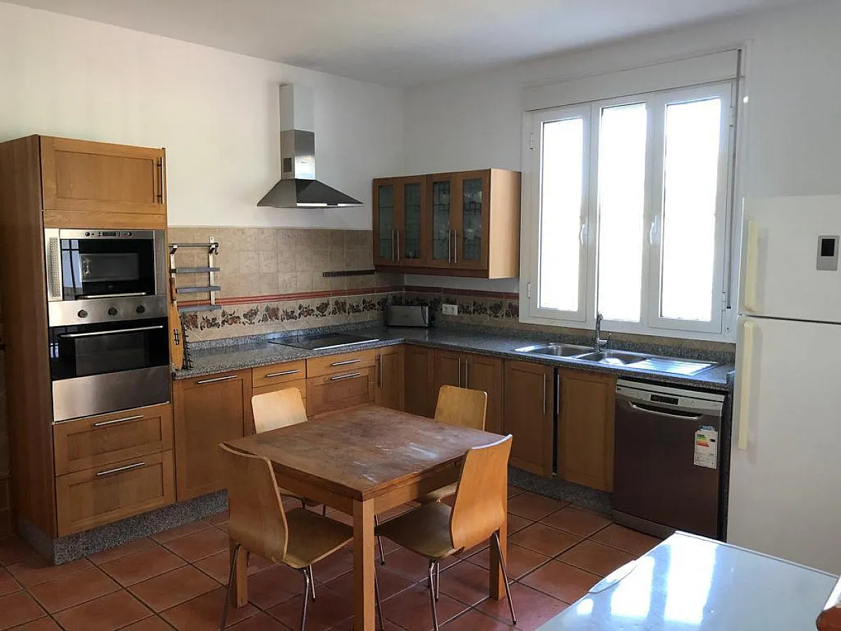 Cocina totalmente amueblada y equipada con vitrocerámica, lavavajillas y horno, entre otros electrodomésticos, y menaje a disposición de los huéspedes. Hay diversos armarios que contienen dicho menaje y demás materiales de cocina, como es la batería. También alberga una mesa de comedor de pequeñas dimensiones.
