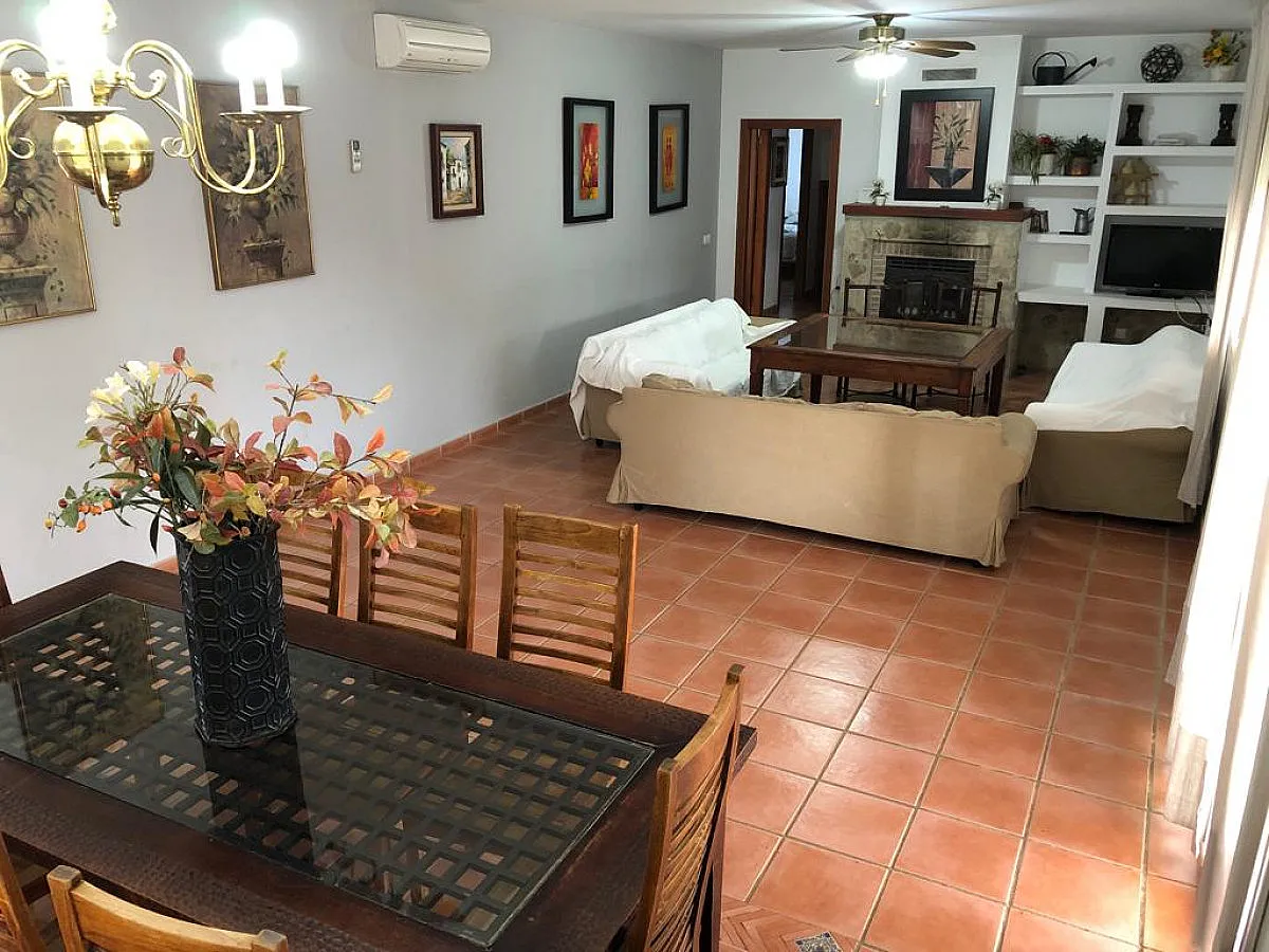 Salón totalmente amueblado y de gran tamaño. Los sofás están colocados de manera que se vea la televisión. A las espaldas de éstos hay colocada una mesa de comedor de mayor tamaño que la que encontraréis en la cocina. Es una de las estancias más luminosas de la casa gracias a los enormes ventanales que la componen.