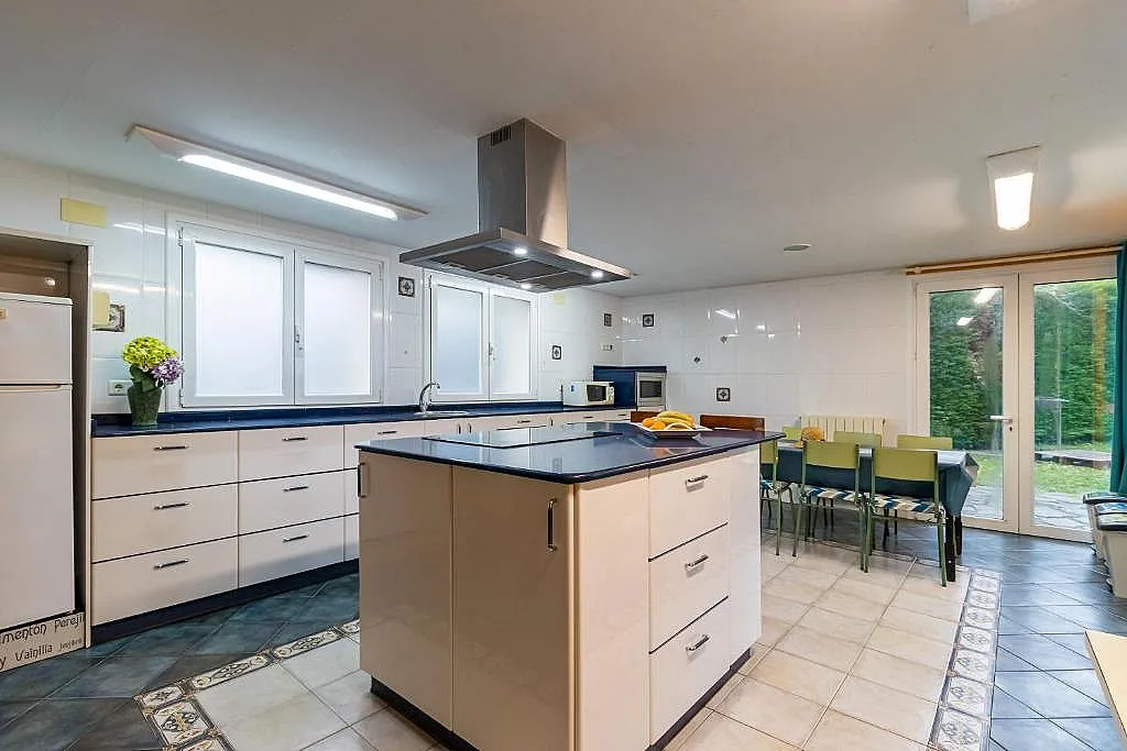 La planta superior alberga 6 habitaciones y 3 baños, con distintas configuraciones de camas para adaptarse a grupos grandes. En la planta inferior se encuentra un amplio salón comedor de 70 m² y una cocina de 50 m² totalmente equipada con electrodomésticos y menaje completo.