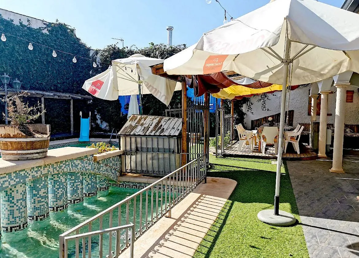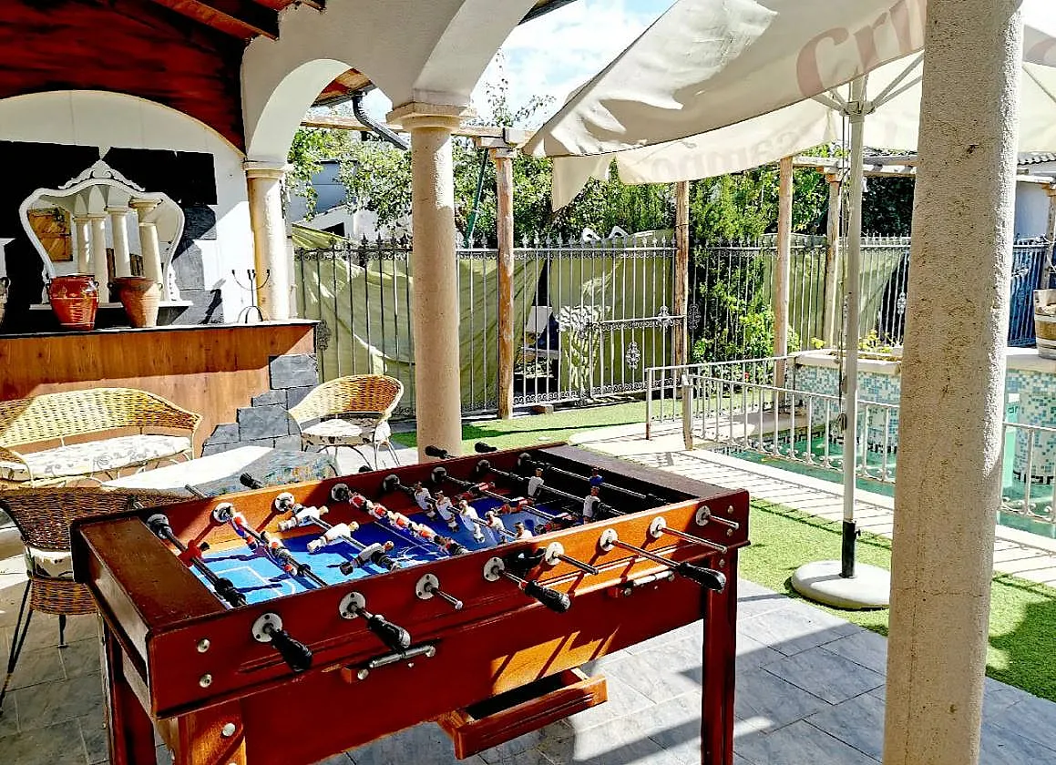 La casa tiene un amplio patio que posee piscina de niños separada de la de adultos, barbacoa, dos cenadores, inmejorable espacio en madera para tomar el sol.En el mismo patio se ha creado un pequeño gimnasio y aseo.