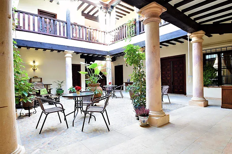 A todas las habitaciones se accede desde un espacioso patio cuadrangular interior, cerrado con techo de cristal, parcialmente aclimatado, las 5 del primer piso lo hacen por un amplio corredor con barandilla, desde el que se contempla el piso bajo.