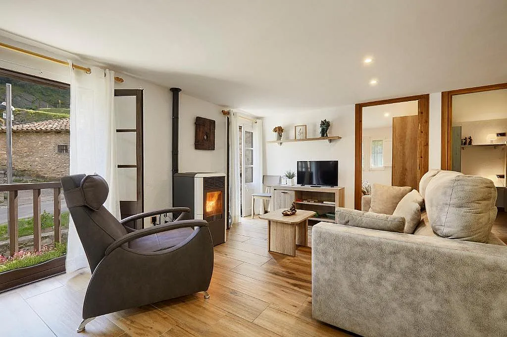 Cada alojamiento dispone de calefacción mediante estufa de pellets, sala de estar con sofá y televisión, conexión wifi, cocina totalmente equipada, baño completo y habitaciones confortables.