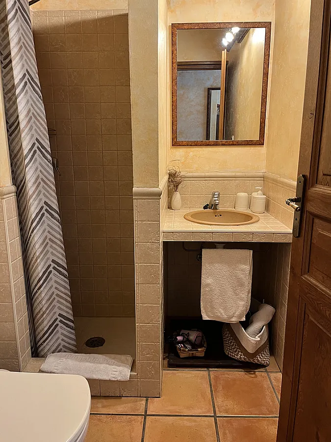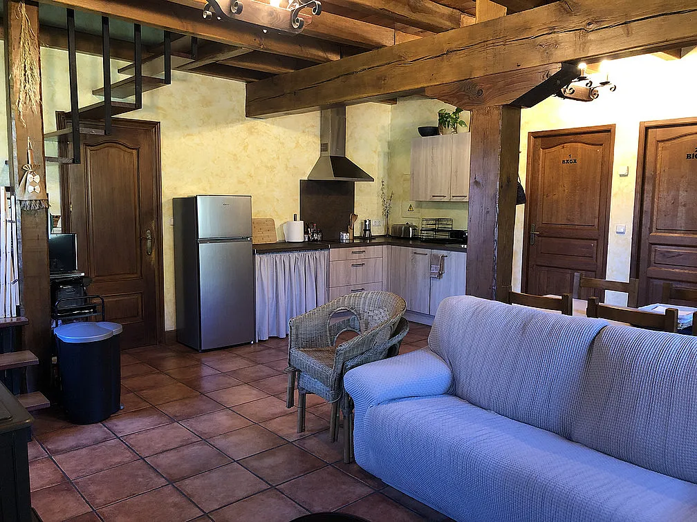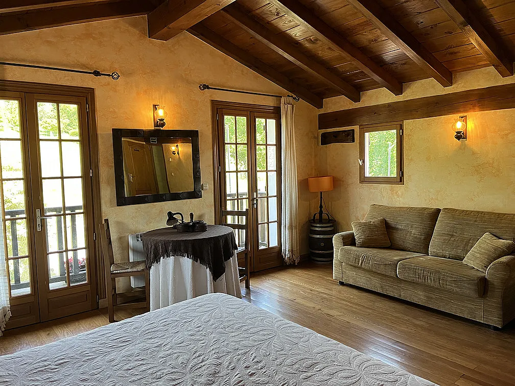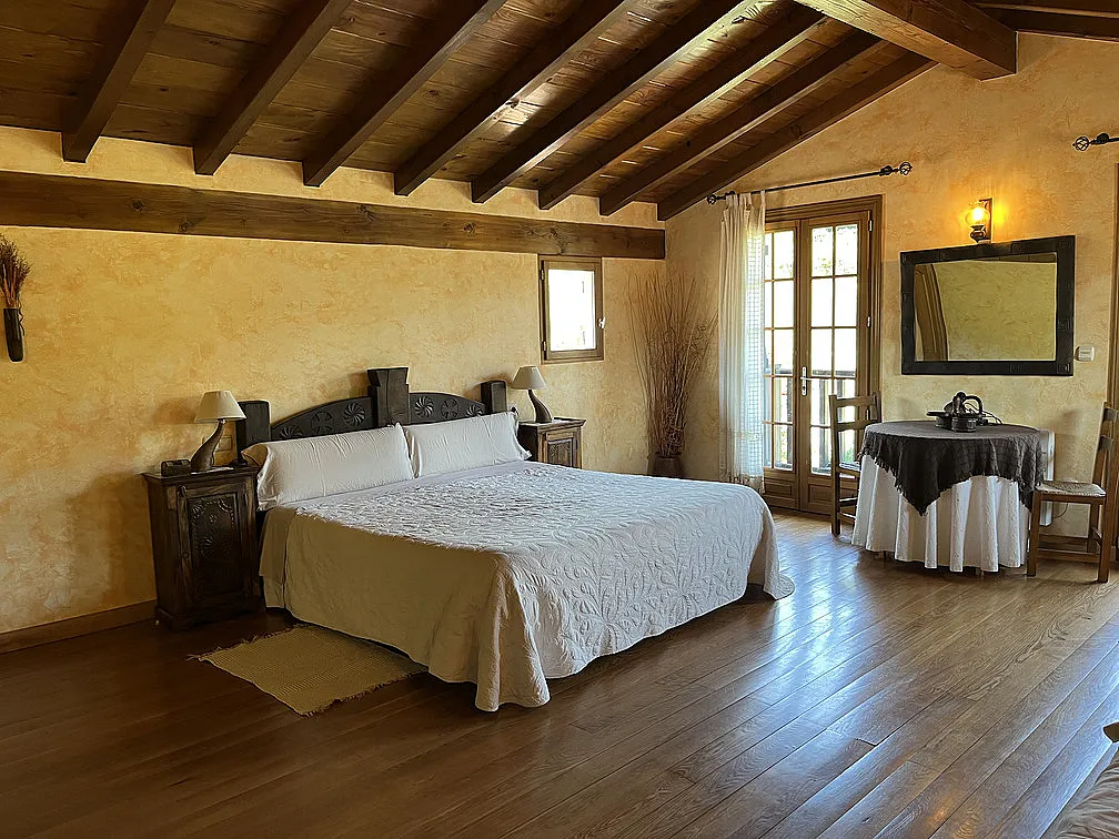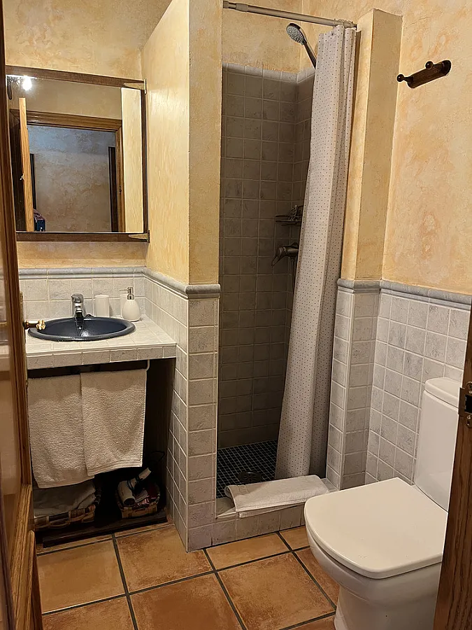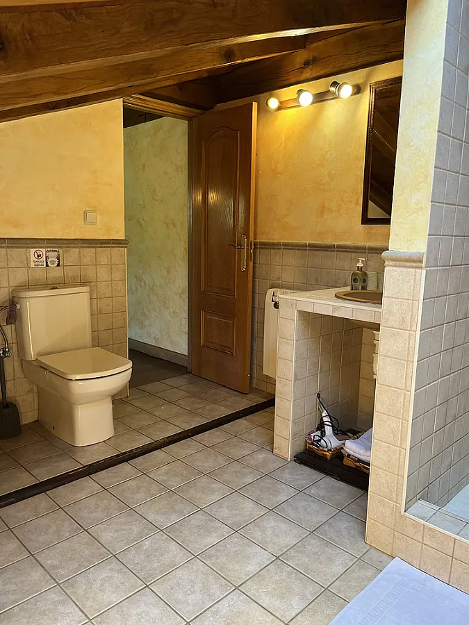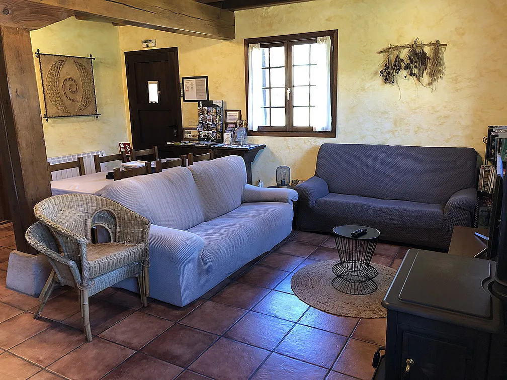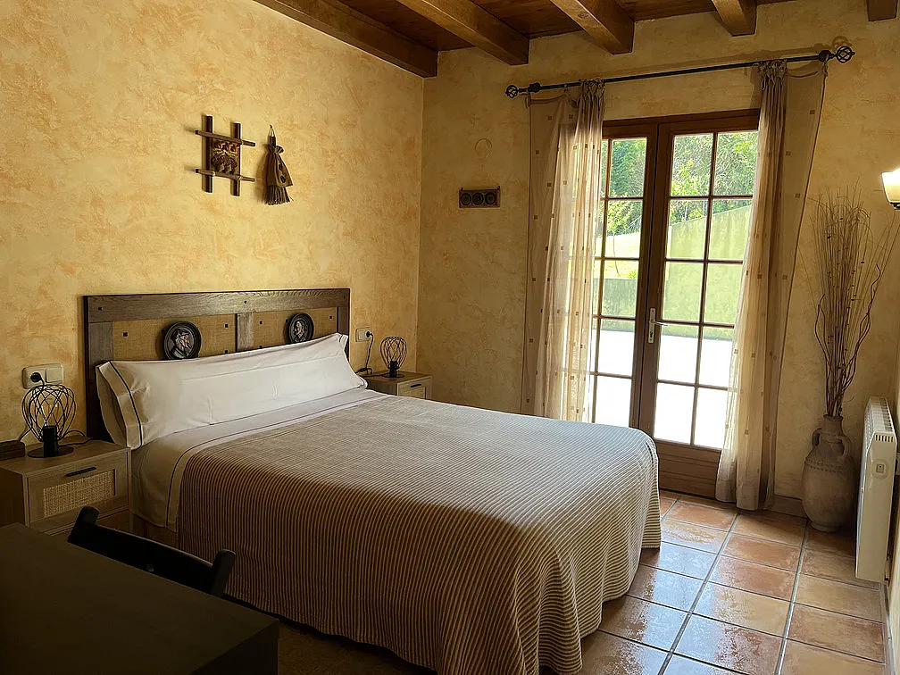 El apartamento consta de 100m2 distribuidos en dos plantas, en el mismo edificio que vivimos los propietarios, pero con acceso independiente (es la mitad derecha de la casa). En la planta baja hay dos habitaciones con camas dobles (una de ellas convertible en dos camas, si se avisa a la hora de realizar la reserva) y una sala con una pequeña cocina incorporada, sofás, TV y estufa de leña para el invierno. En la segunda planta hay una habitación más grande con opción a una cama supletoria. Cada habitación tiene su baño con ducha. La capacidad que tiene es como para 6 adultos y un niñ@. No se puede fumar en el interior.
